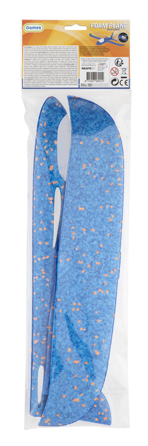 Avion planor din spuma cu luminite - Albastru este o jucarie de exterior potrivita pentru copiii care se bucura de jocuri active si lansari repetate in aer liber. Datorita constructiei usoare si modului simplu de asamblare, Avion planor din spuma cu luminite - Albastru poate fi pregatit rapid pentru joaca si pentru sesiuni distractive de lansare.