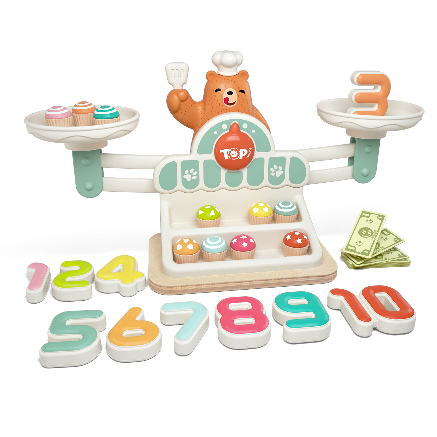 Balanta - Cofetaria ursuletului include o balanță cu doua tavi, 10 greutati sub forma de numere, 10 greutati in forma de briose, 10 bancnote si un ursulet sef bucatar, oferind o experienta completa de invatare prin joaca.