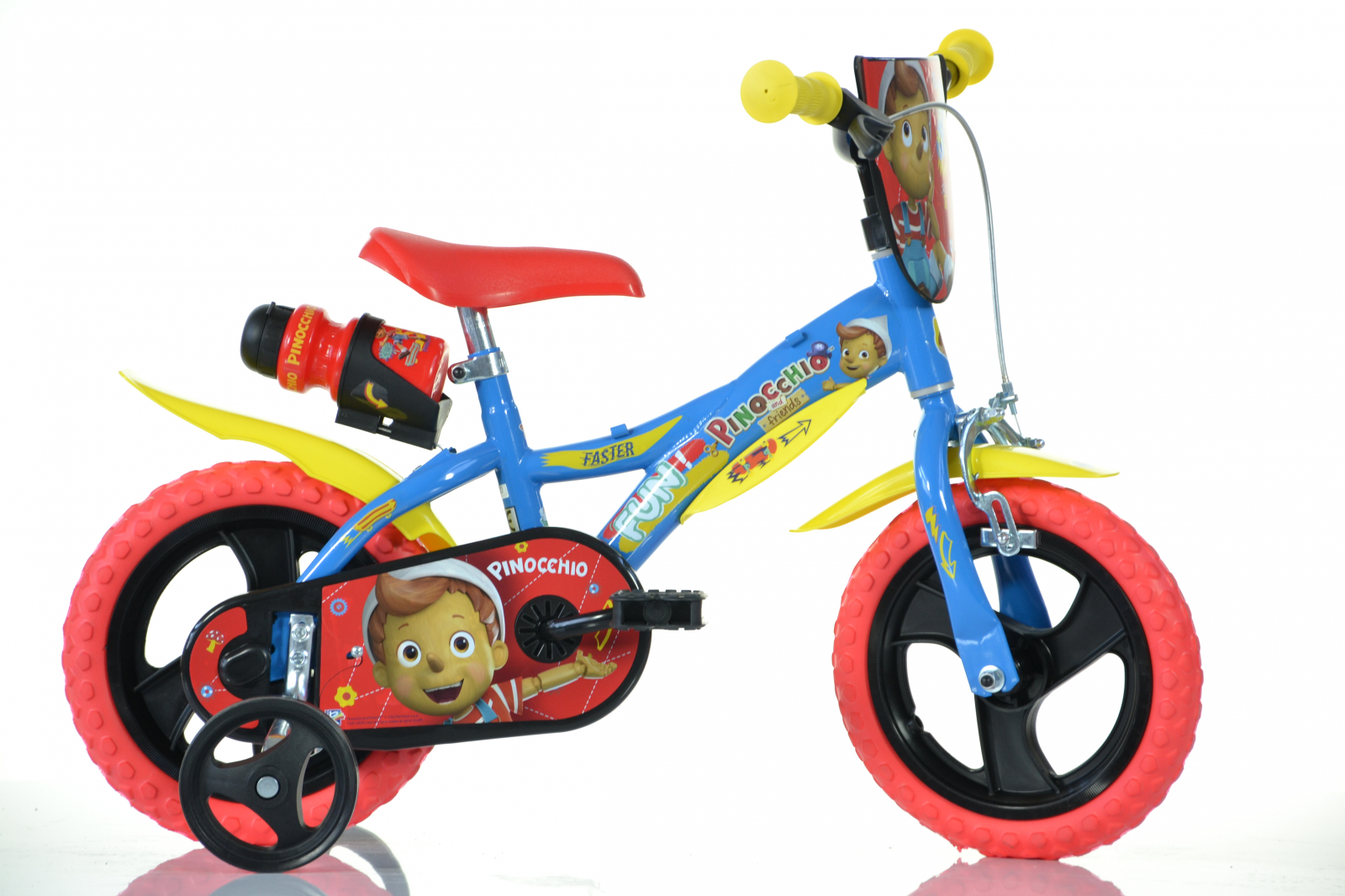 Bicicleta 12'' Pinocchio Dino Bikes are cadru din otel pentru rezistenta in utilizarea de zi cu zi. Rotile sunt de 12 inch, cu anvelope din plastic cu umplutura din spuma EVA (fara grija camerelor de aer) si spite din plastic. Setul include accesorii practice: aparatoare din plastic pentru lant si aripi din plastic fata/spate.
