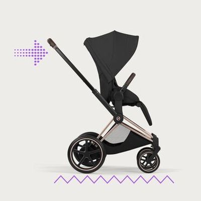 Cadru carucior Cybex e-Priam Style Matt Black este echipat cu suspensie pe toate rotile si cu roti mari, configuratie care contribuie la o rulare mai lina pe suprafete variate. In utilizare reala, aceasta inseamna mai mult confort pentru copil si mai mult control pentru parinte, atat pe asfalt, cat si pe trasee mai dificile sau denivelate.