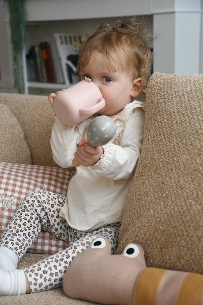 Realizata integral din silicon moale, cana este usoara, rezistenta si placuta la atingere, fara risc de spargere daca este scapata pe jos. Manerele late sunt special dimensionate pentru prinderea usoara de catre copil, iar baza groasa ofera stabilitate pe masa. Nuanta delicata Cotton Candy se integreaza usor in seturile de masa pentru bebelusi si se potriveste atat pentru fete, cat si pentru baieti. Cana de antrenament silicon Beaba Cotton Candy este fabricata din silicon alimentar, fara BPA, pentru utilizare zilnica in siguranta.