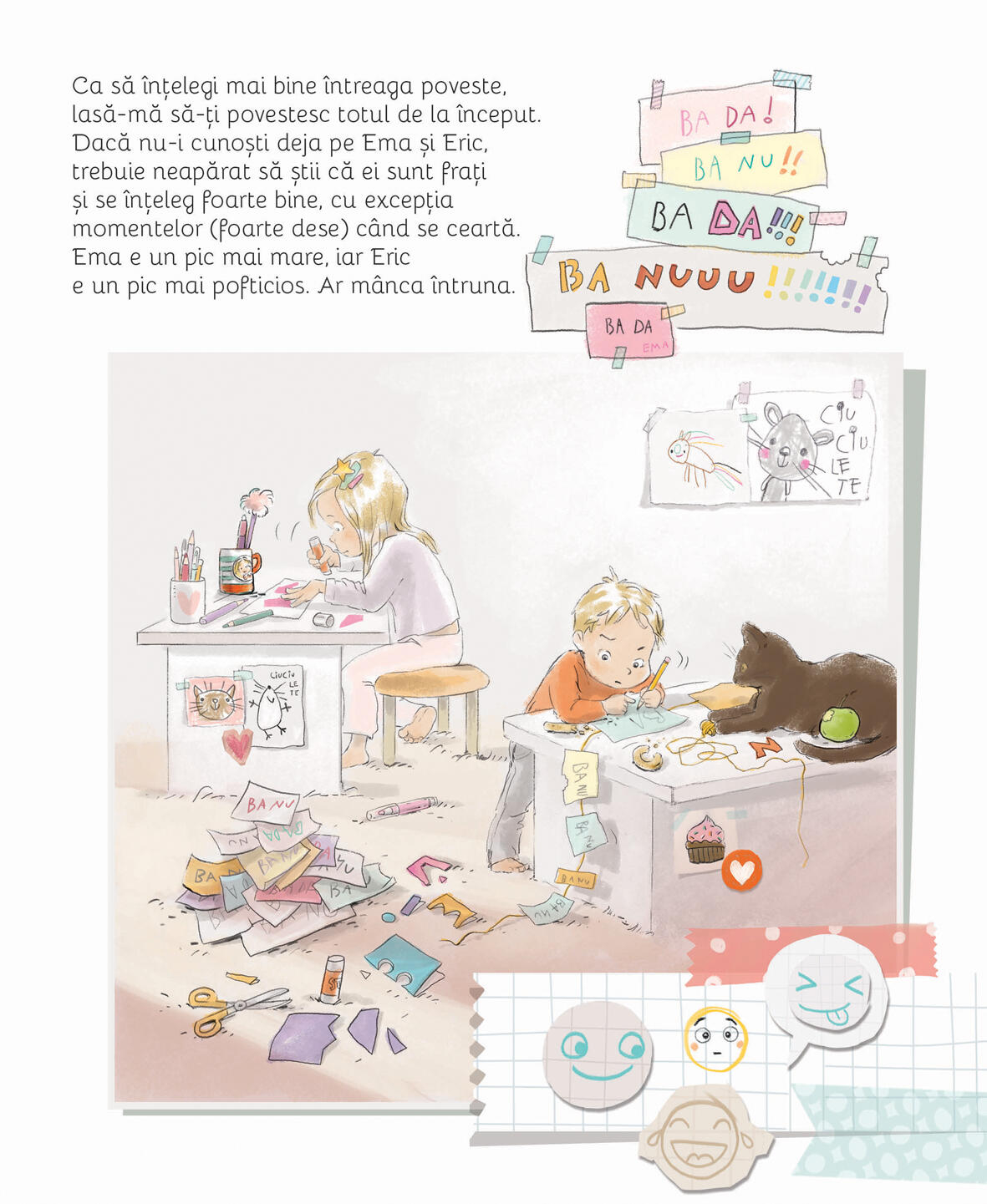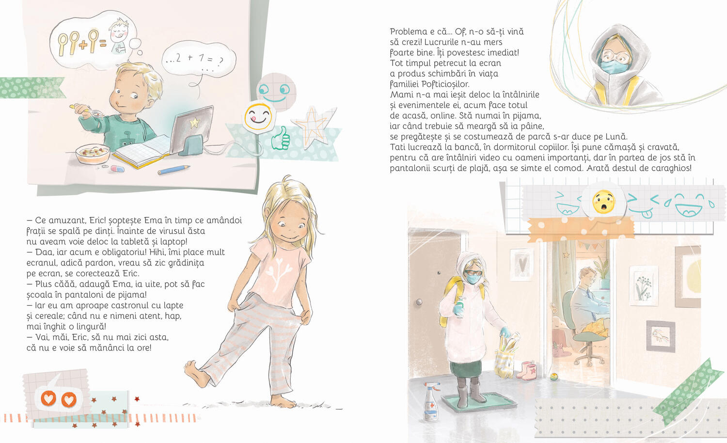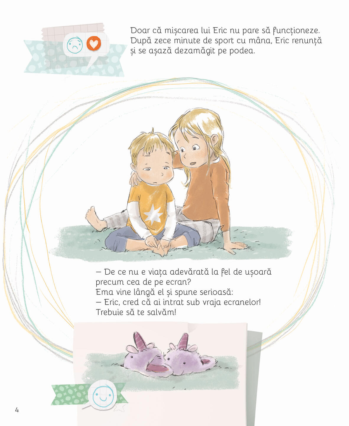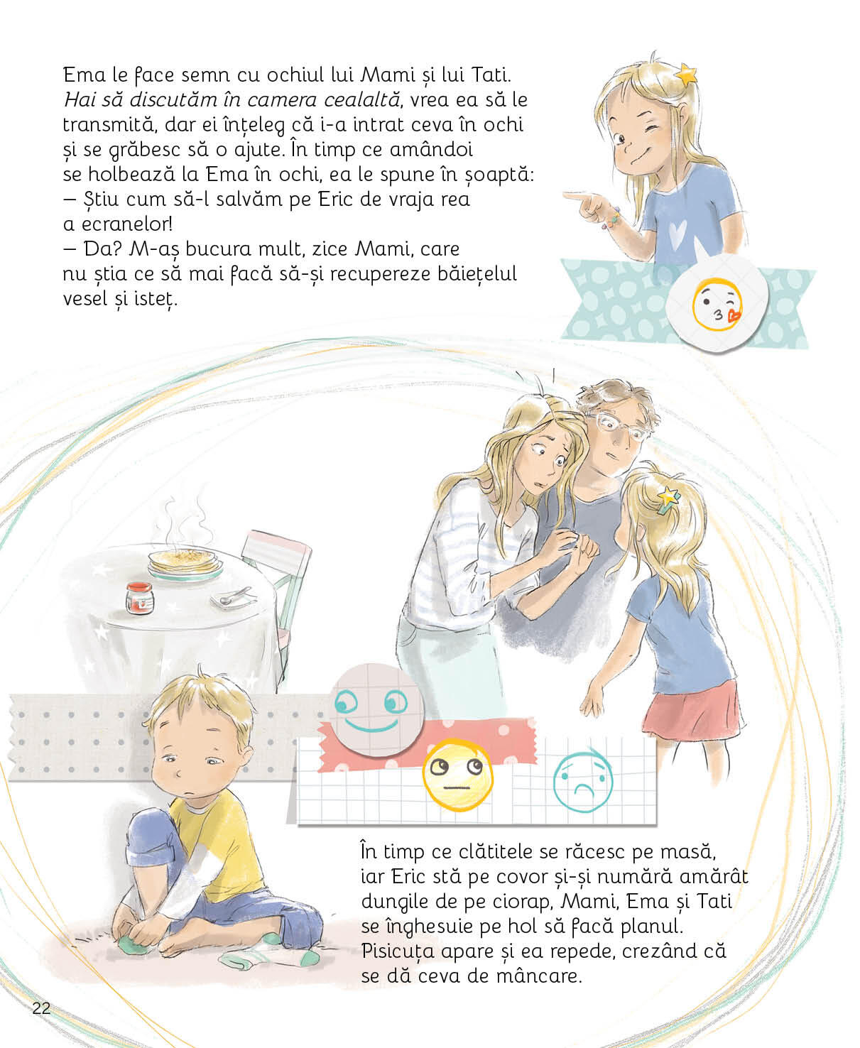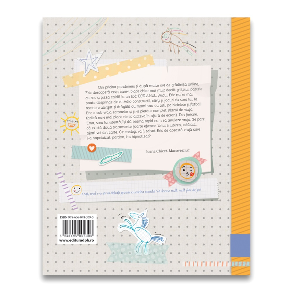 Din pricina pandemei si dupa multe ore de gradinita online, Eric descopera ceva care-i place chiar mai mult decat snitelul, pastele cu sos si pizza calda la un loc: ECRANUL. Micul Eric nu se mai poate desprinde de el. Adio carti si jocuri cu sora lui, la revedere alergat si dragalit cu mami sau cu tati, pa biciclete si fotbal! Eric e sub vraja ecranelor si si-a pierdut complet placul de viata (adica nu-i mai place nimic altceva in afara de ecran). Din fericire, Ema, sora lui isteata, isi da seama rapid cum sa anuleze vraja. Se pare ca exista doua tratamente foarte eficace.