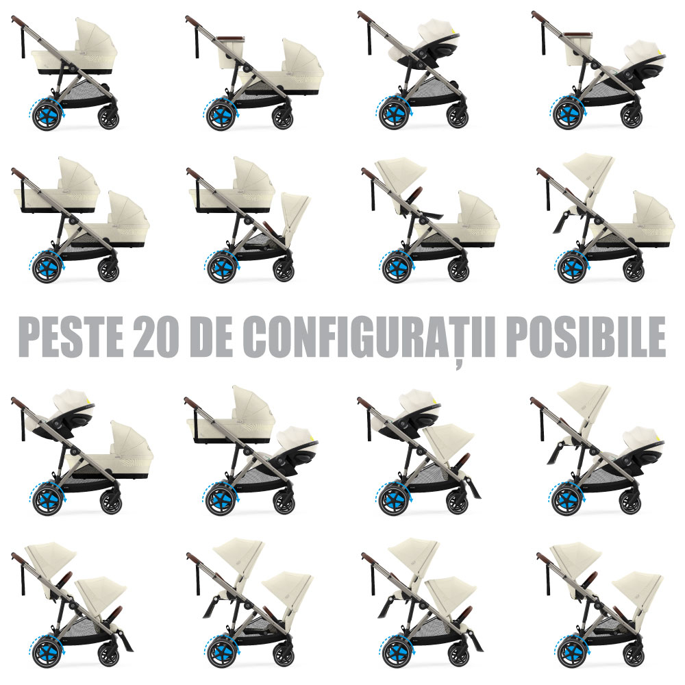 - Modul gemeni: utilizati diverse configuratii impreuna cu landourile, partile sport sau scoicile Cybex. Acest lucru permite celor doi copii sa calatoreasca asigurandu-le acelasi grad de confort.