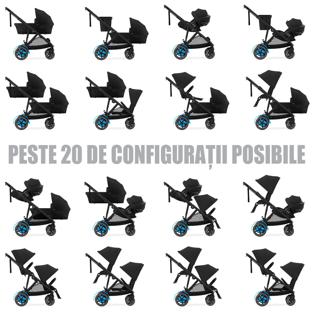 - Modul gemeni: utilizati diverse configuratii impreuna cu landourile, unitatile de scaun sau scoicile auto Cybex. Acest lucru permite celor doi copii sa calatoreasca asigurandu-le acelasi grad de confort.