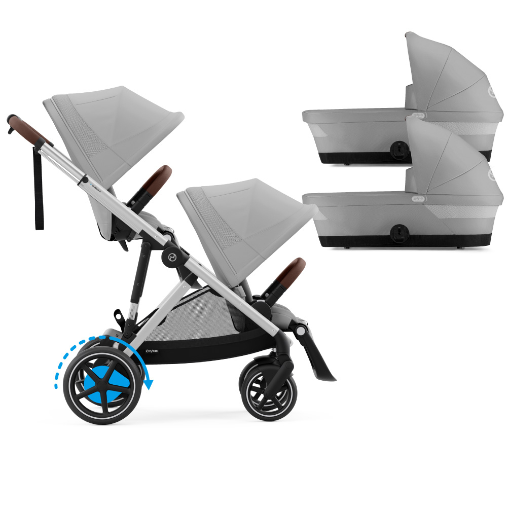- Modul gemeni: utilizati diverse configuratii impreuna cu landourile, unitatile de scaun sau scoicile auto Cybex. Acest lucru permite celor doi copii sa calatoreasca asigurandu-le acelasi grad de confort.