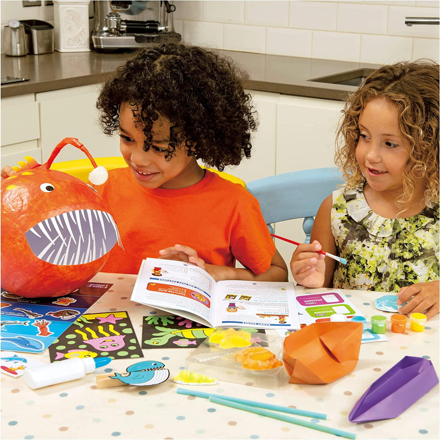 Setul Creeaza si descopera- Oceanul include ipsos pentru modelaj, vopsea colorate, pensule, forme pentru animale marine, nisip colorat, hartie pentru origami si multe alte materiale. Copiii pot crea pesti stralucitori, barci origami si scene de corali, dezvoltand abilitatea de a intelege relatia cauza-efect si lumea acvatica.