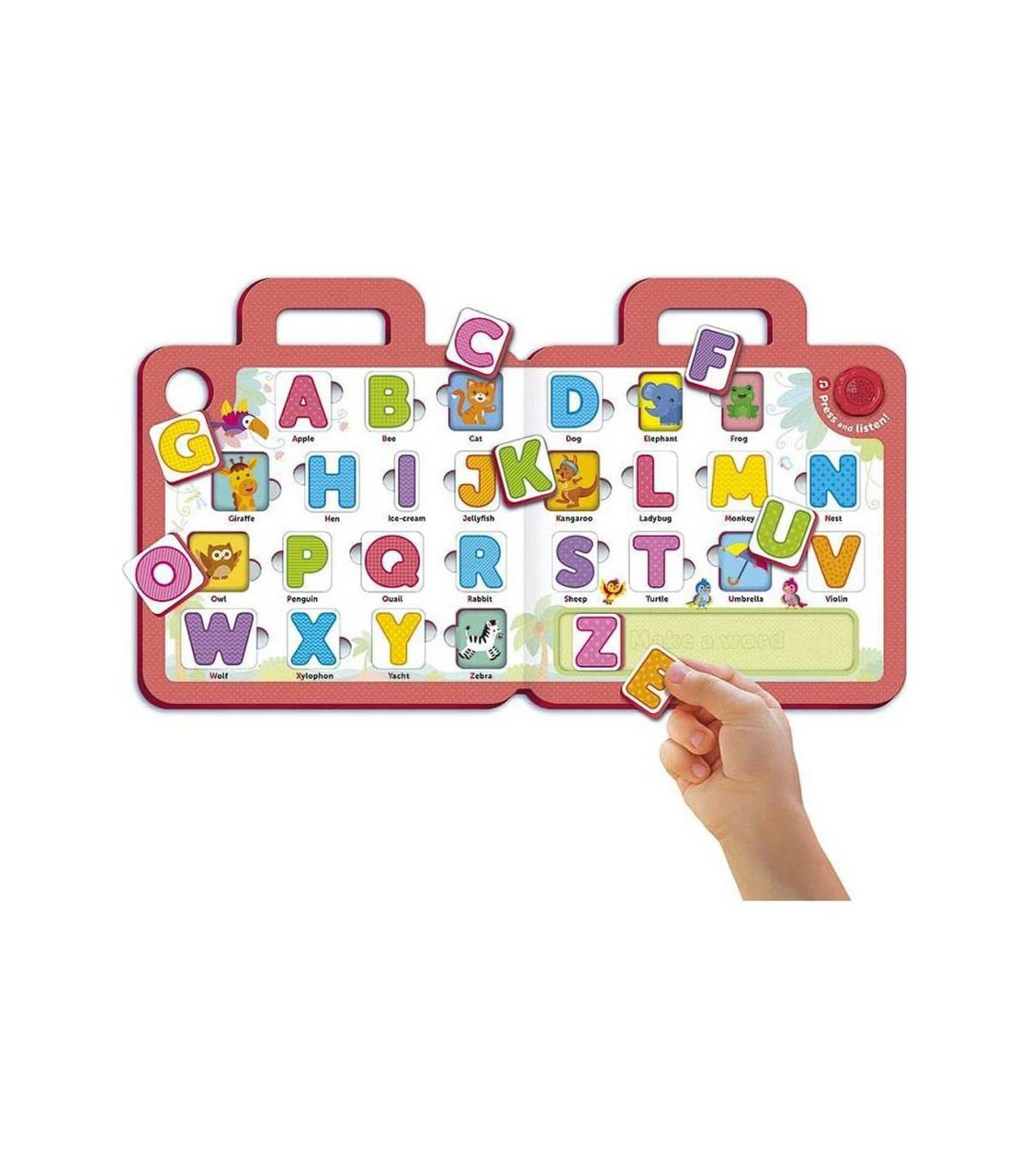 Geanta cu sunete - Alfabet Interactiv in limba engleza este o jucarie educativa care ii ajuta pe copii sa invete alfabetul englezesc prin joaca. Cei mici se vor distra ascultand 20 de propozitii, sunete si melodii in limba engleza, dezvoltand astfel abilitati de ascultare si vocabular.