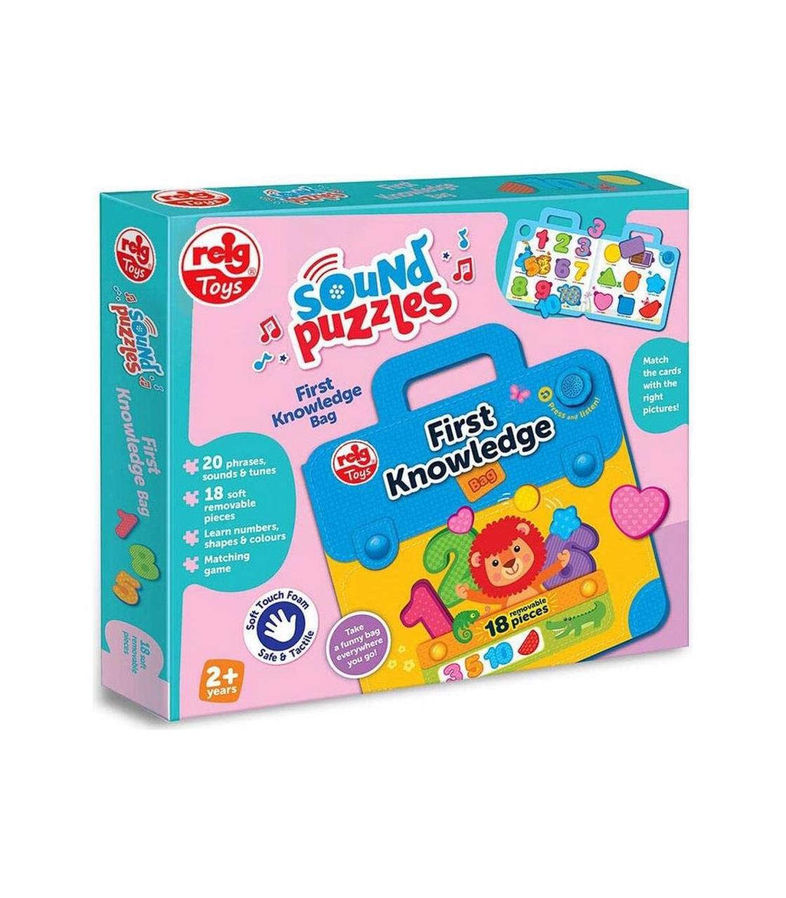 Gentuta contine 18 forme detasabile, realizate din material moale, sub care se afla imagini diverse. Copiii pot aseza piesele puzzle, pot numara animalele din imagini si pot recunoaste cifrele si formele geometrice, exersand limba engleza intr-un mod distractiv si interactiv.