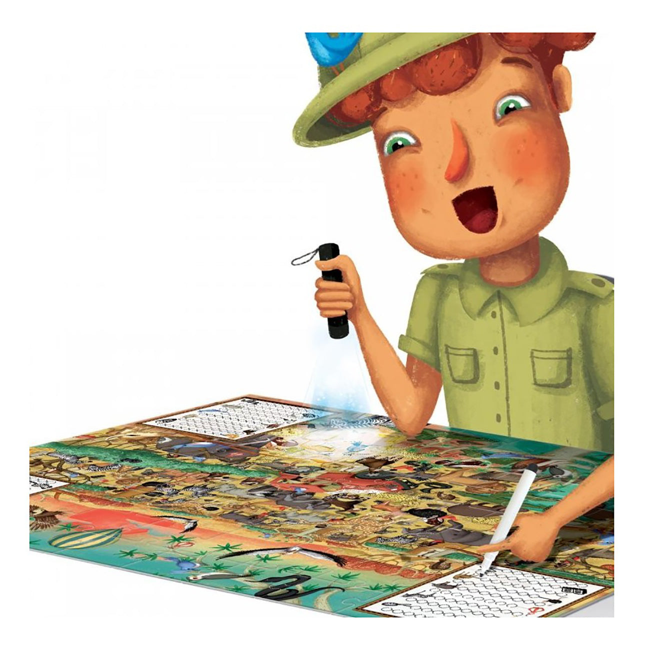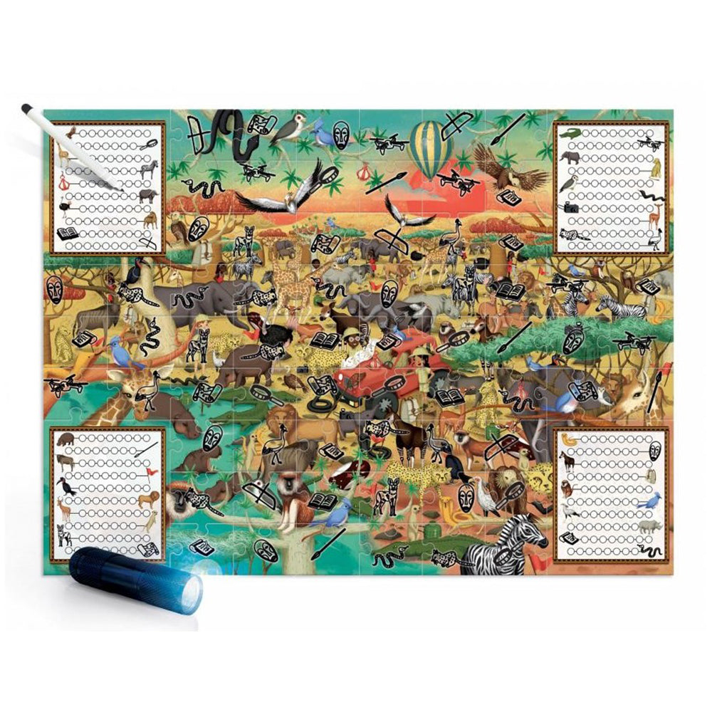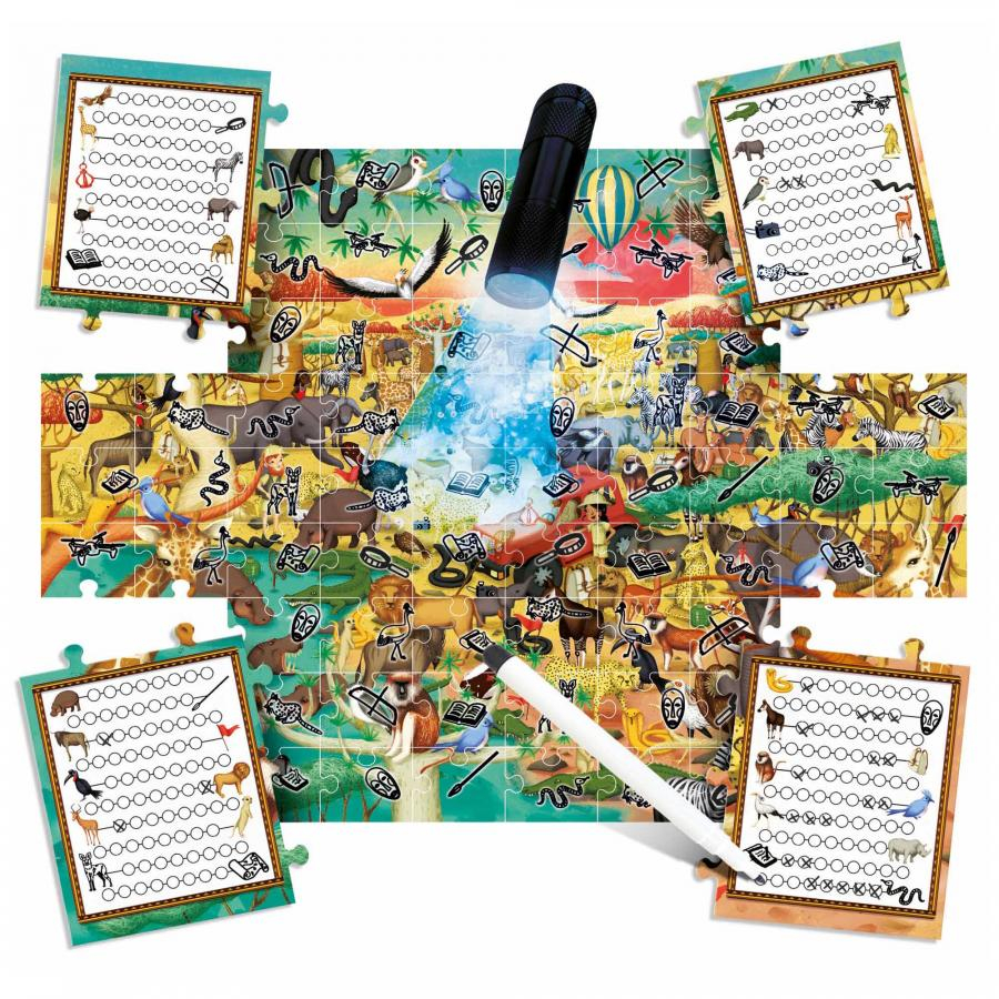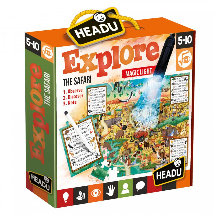 Setul Headu Stem - Joc Explorati Safari include un puzzle cu dimensiunea de 60 x 44 cm format din 70 de piese, un creion si o lanterna UV (functioneaza cu 3 baterii AAA - nu sunt incluse). Prin acest joc, cei mici pot explora ilustratii detaliate si pot descoperi elemente invizibile cu ochiul liber. Este o activitate perfecta pentru dezvoltarea spiritului de observatie si a gandirii stiintifice.