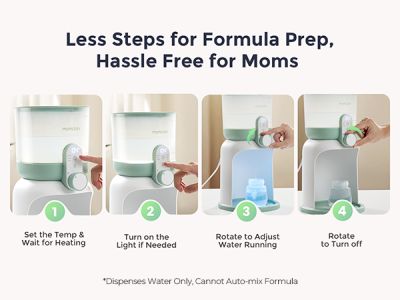 Cele 6 optiuni de temperatura permit adaptarea in functie de formula folosita si de preferintele familiei. Incalzitor de apa Momcozy Dual Lights pentru mese nocturne nu amesteca automat formula; el furnizeaza apa calda, iar pudra de lapte se adauga manual, pentru dozare corecta.