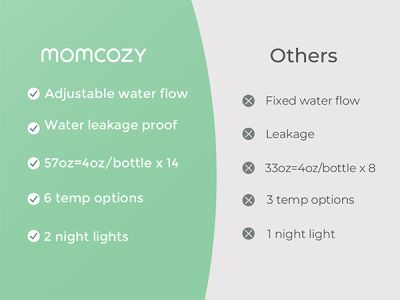 Cu doua lumini nocturne, 6 setari de temperatura, rezervor mare de 1.6 L si control precis al debitului, Incalzitor de apa Momcozy Dual Lights pentru mese nocturne este gandit pentru hranirile dese, pentru mesele de noapte si pentru o rutina mai simpla atunci cand fiecare minut conteaza.
