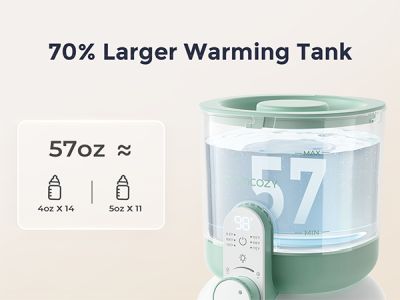 Rezervorul de 57 oz poate pregati aproximativ pana la 14 biberoane de 120 ml sau pana la 11 biberoane de 150 ml, reducand nevoia de reumplere frecventa. Aceasta capacitate este utila mai ales in primele luni, cand mesele sunt dese si rutina de hranire se repeta de mai multe ori pe zi.