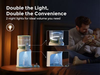 Luminile nocturne duble ofera vizibilitate suficienta pentru masurarea apei si pregatirea biberonului, dar raman blande pentru atmosfera de somn. Aceasta functie ajuta parintii sa pregateasca masa mai usor, fara sa trezeasca complet bebelusul sau sa intrerupa prea mult rutina de noapte.