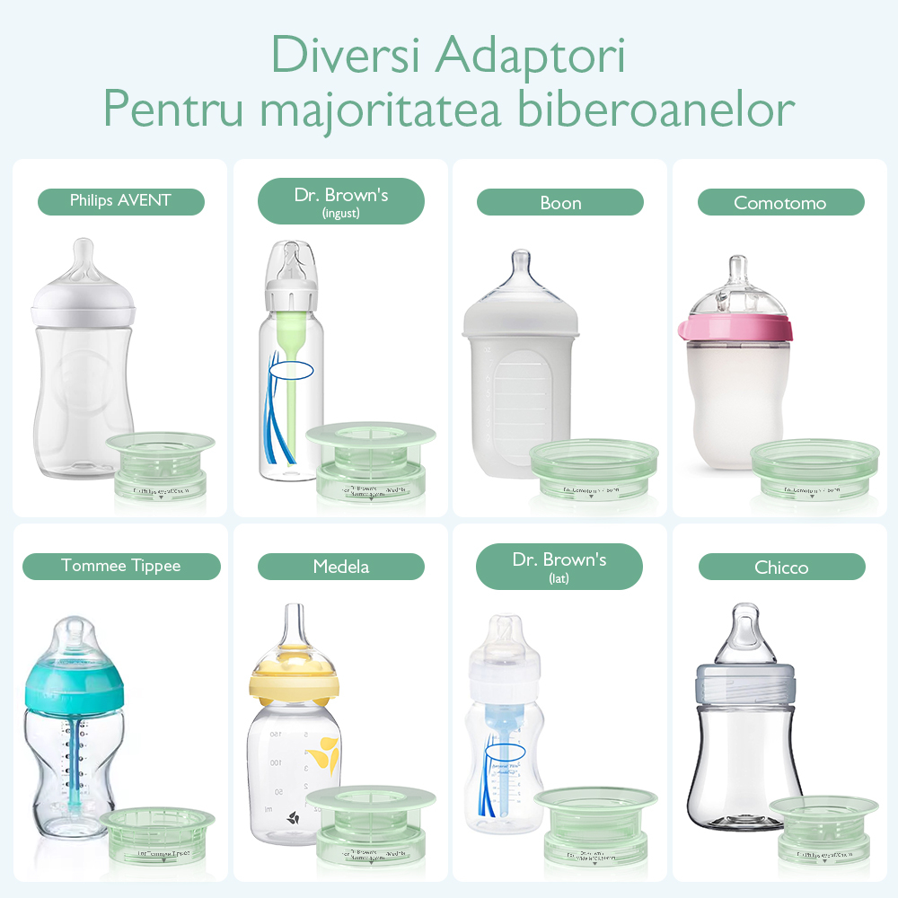 Pachetul include adaptoare multiple pentru a se potrivi cu cele mai uzuale biberoane cu gat ingust sau larg. Astfel reduci nevoia de recipiente separate si pastrezi fluxul obisnuit al rutinei. Etansarile din silicon si designul dublu-seal limiteaza scurgerile in timpul incalzirii si al transportului.
