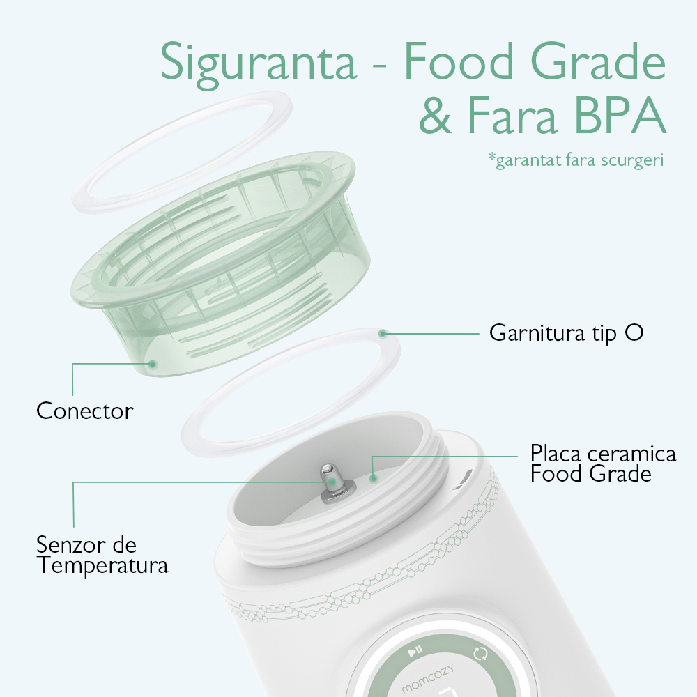 Componentele care intra in contact cu lichidul sunt din materiale food-grade, fara miros sau substante nedorite. Corpul cu perete dublu si garniturile suplimentare impiedica scaparile, iar constructia compacta permite depozitare usoara in geanta bebelusului.