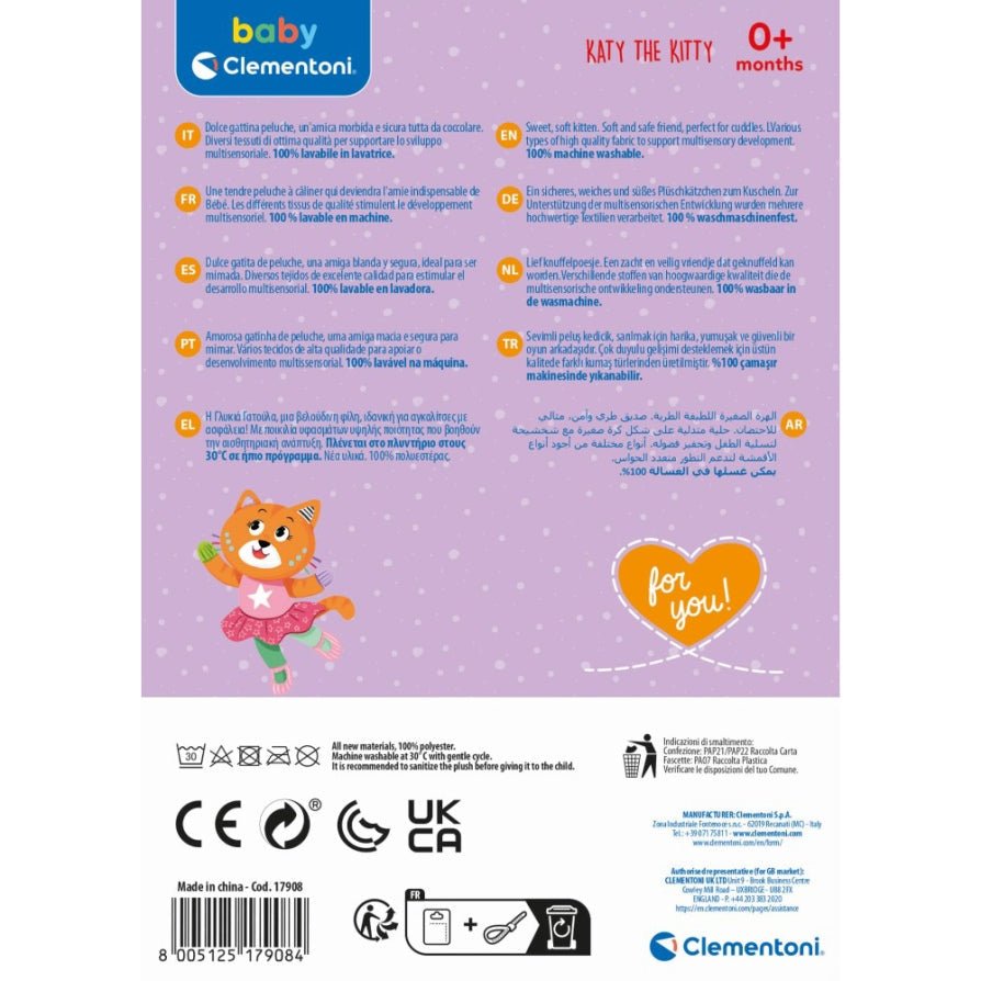 Jucarie de plus pisicuta Katy este desenata, testata si creata in Italia pentru a-ti oferi un produs sigur si de calitate. Baby Clementoni ofera jucarii gandite sa ajute copilul sa creasca vesel si curios, fiind in acelasi timp sigure si placute.
