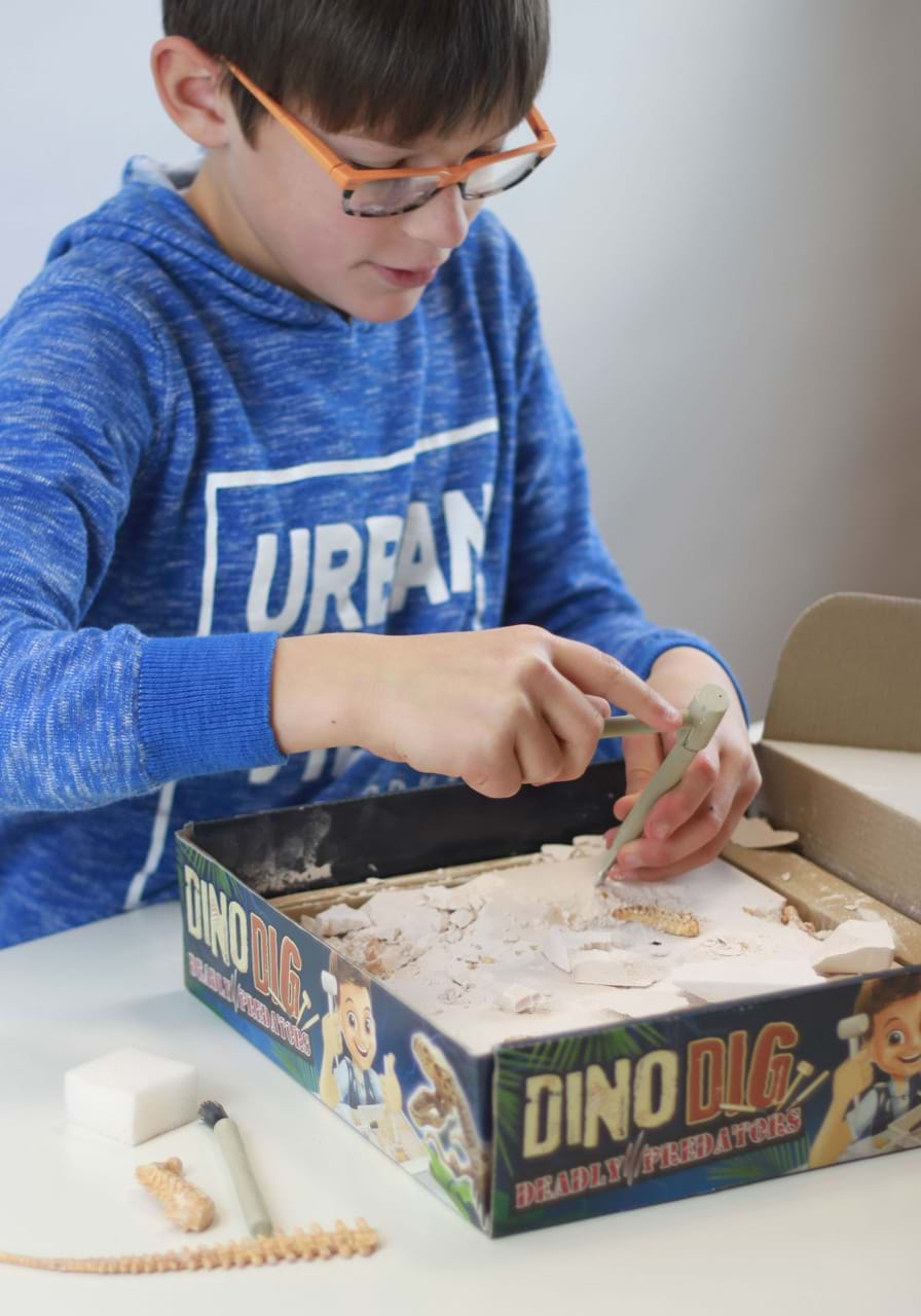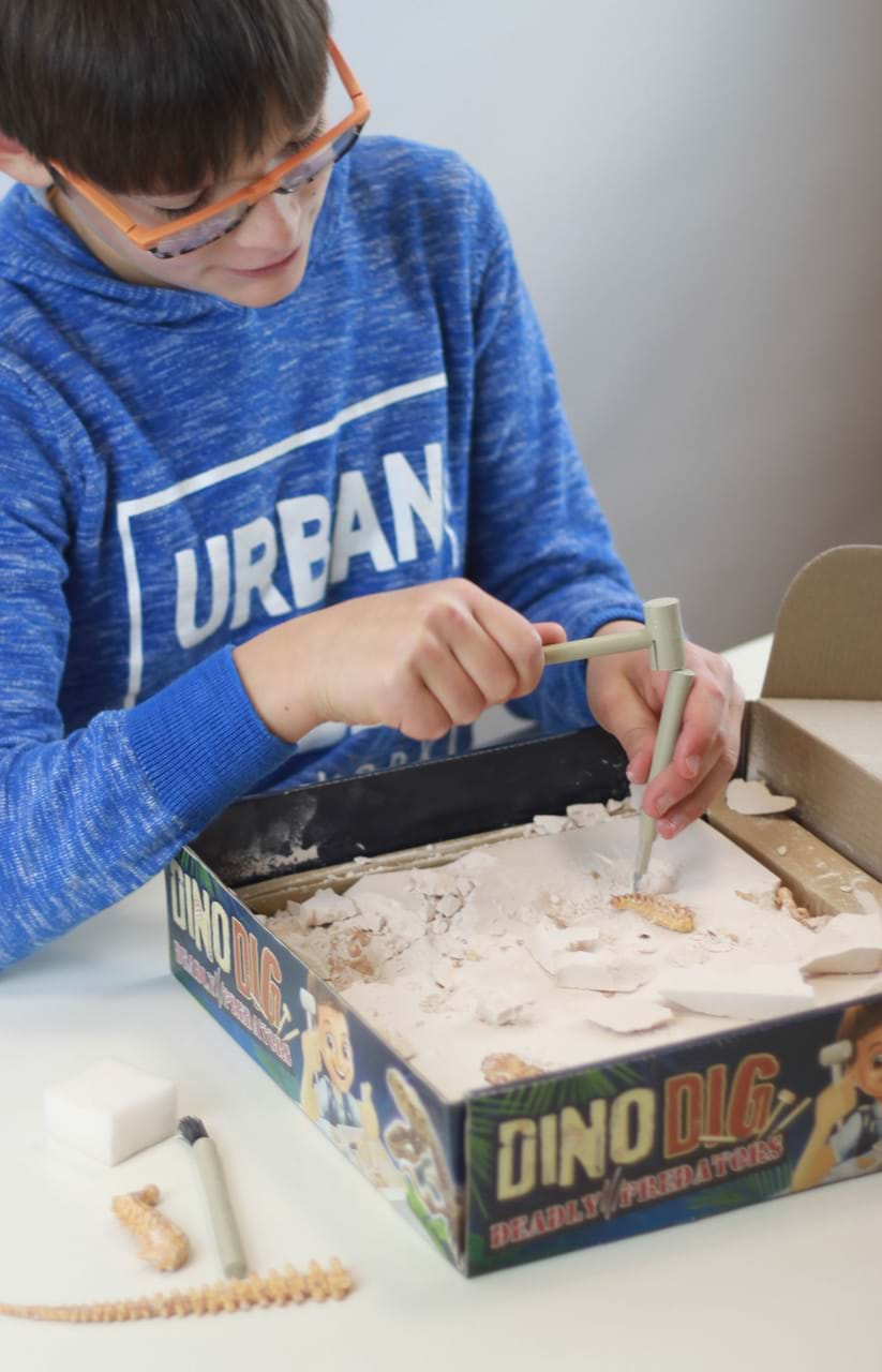 Folositi instrumentele incluse (ciocan, dalta, perie, burete) pentru a descoperi cei doi dinozauri.