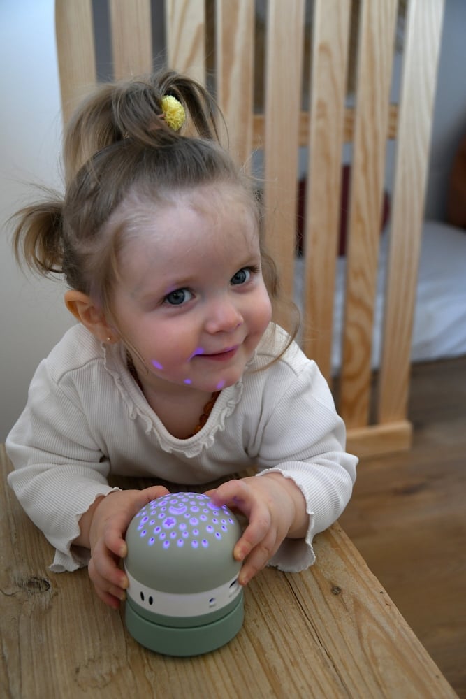 Cu Lampa de veghe cu proiector Beaba Pixie Sage Green poti crea rapid o atmosfera magica: proiecteaza un cer instelat in trei culori (rosu, verde, albastru), statice sau in miscare. Ai la dispozitie mod fix, miscare sau mod aleatoriu, astfel incat sa gasesti combinatia care il linisteste cel mai bine pe copil. Proiectia se poate orienta manual, astfel incat lumina sa fie directionata spre tavan, perete sau o anumita zona din camera.