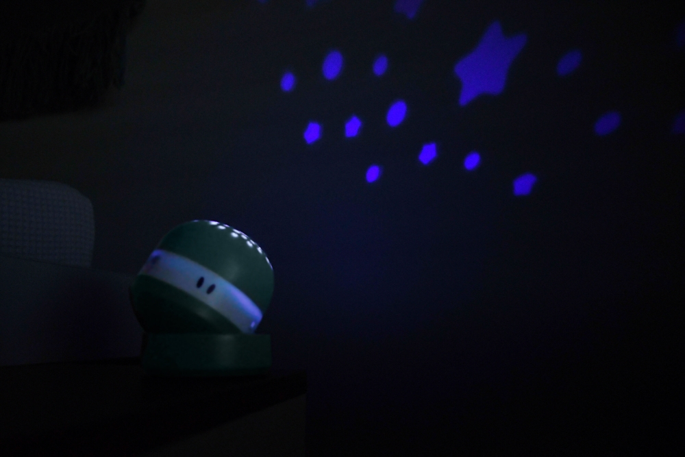 Unul dintre atuurile produsului este senzorul de plans: daca bebe incepe sa planga, lampa se reactiveaza automat cu muzica si proiectie rosie, pentru a favoriza secretia hormonului somnului si pentru a il reasigura. In plus, pentru a economisi energie si a nu deranja somnul, lampa are oprire automata dupa aproximativ 20 de minute, astfel incat nu trebuie sa revii special in camera pentru a o stinge.