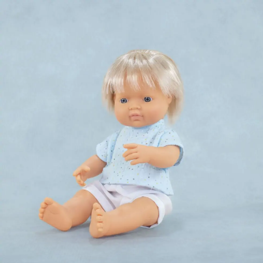 Papusa baiat caucazian blond 38 cm cu tricoul bleu, corp parfumat, colectia My Friends and Me este un partener ideal pentru joaca simbolica si dezvoltarea abilitatilor sociale ale copiilor. Realizata cu atentie la detalii si imbracata intr-un tricou bleu atragator, aceasta papusa incurajeaza empatia si imaginatia.