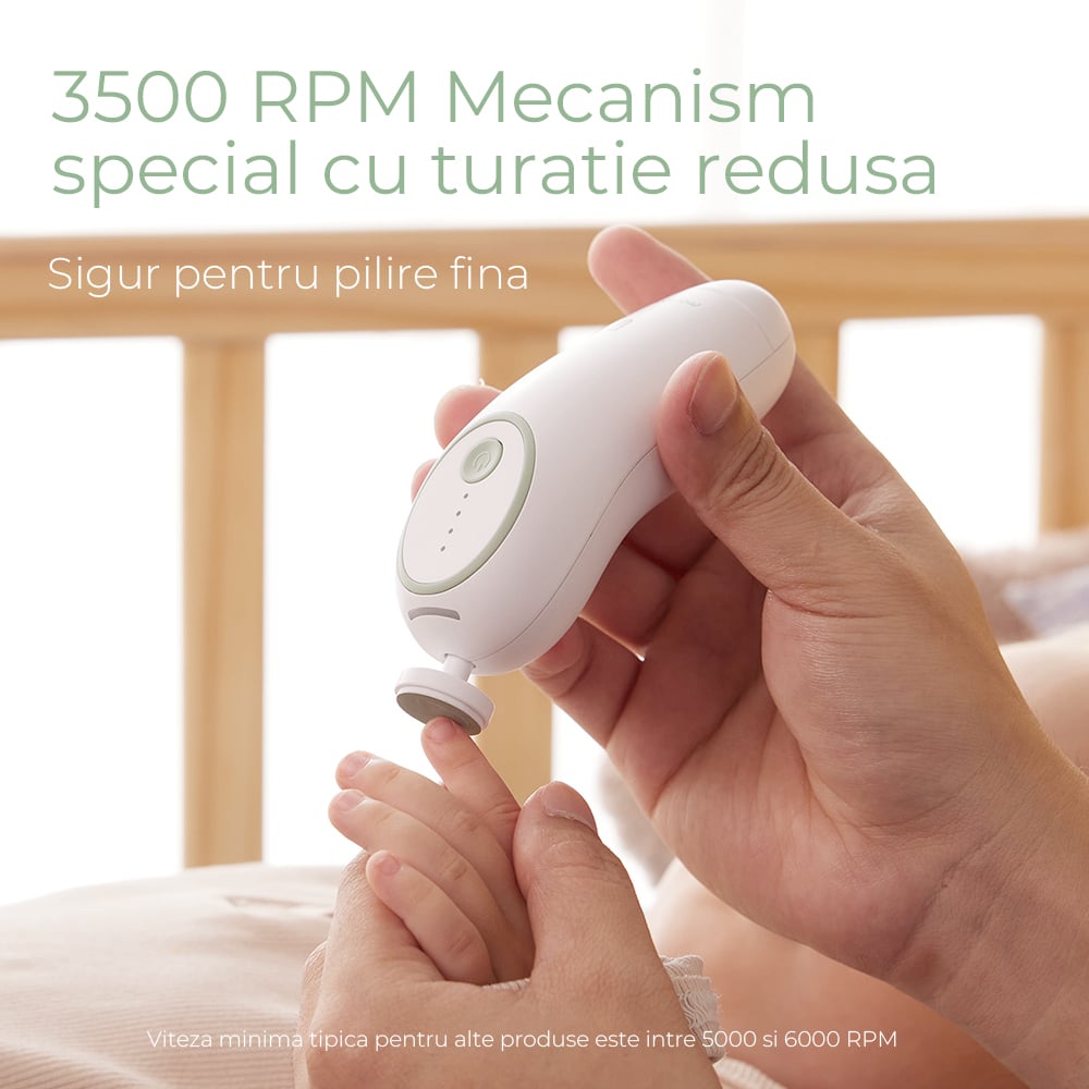Lumina LED 360 evidentiaza linia unghiei, iar turatia minima (potrivita pentru nou-nascuti) scade riscul micro-zgarieturilor. Mecanismul touch-and-stop adauga un nivel suplimentar de protectie: daca apesi prea tare si atingi pielea, motorul se opreste instant. Pila de unghii electrica Momcozy silentioasa mentine zgomotul sub pragul care ar putea speria copilul, pentru o rutina linistita.