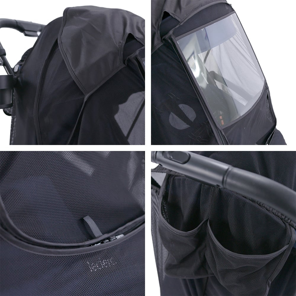 • Include 2 buzunare mari din plasa, ideale pentru accesorii mereu la indemana parintelui.