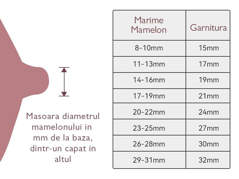 Setul include colectoare de lapte de 180 ml (6 oz). Pentru o utilizare mai comoda si pentru a reduce riscul de scurgeri, este recomandat sa pompezi pana la 120 ml (4 oz). Garnitura standard este de 24 mm, iar pentru potrivire mai precisa poti achizitiona garnituri de alte dimensiuni (15 / 17 / 19 / 21 / 27 mm).