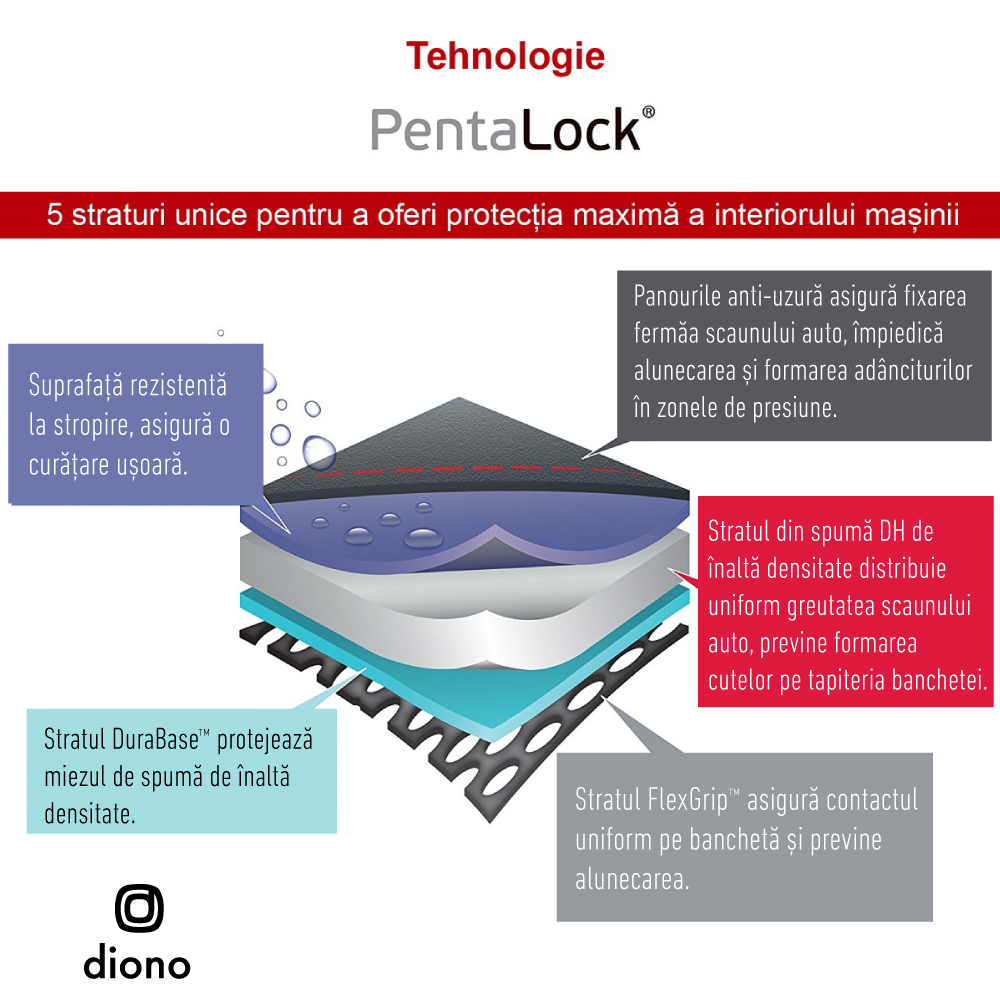 Diono Ultra Mat XXXL ofera protectie completa, protejeaza tapiteria banchetei impotriva zgarieturilor si urmelor de frecare provocate de scaunul auto pentru copii. Potrivire perfecta pe bancheta din spate, acoperire pe 3 locuri, ideala pentru toate scaunele auto sau animale de companie. Tehnologia Pentalock ofera protectie in 5 straturi, protejeaza impotriva scurgerilor si uzurii generale, asigurand in acelasi timp o aderenta suplimentara scaunului auto pentru copii.
