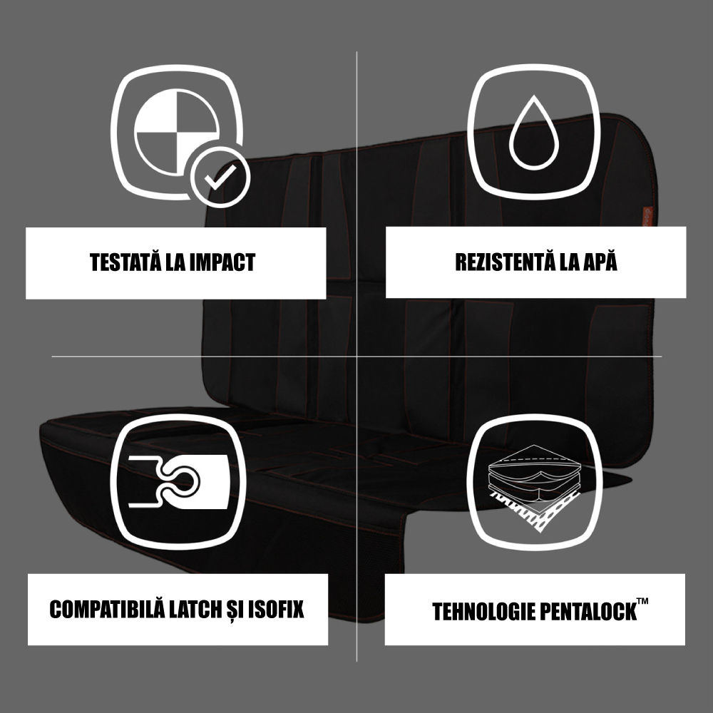 • Acopera intreaga bancheta din spate, pentru o protectie completa a tapiteriei impotriva murdariei si zgarieturilor.