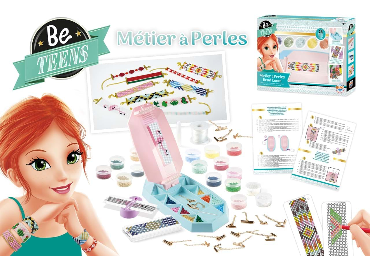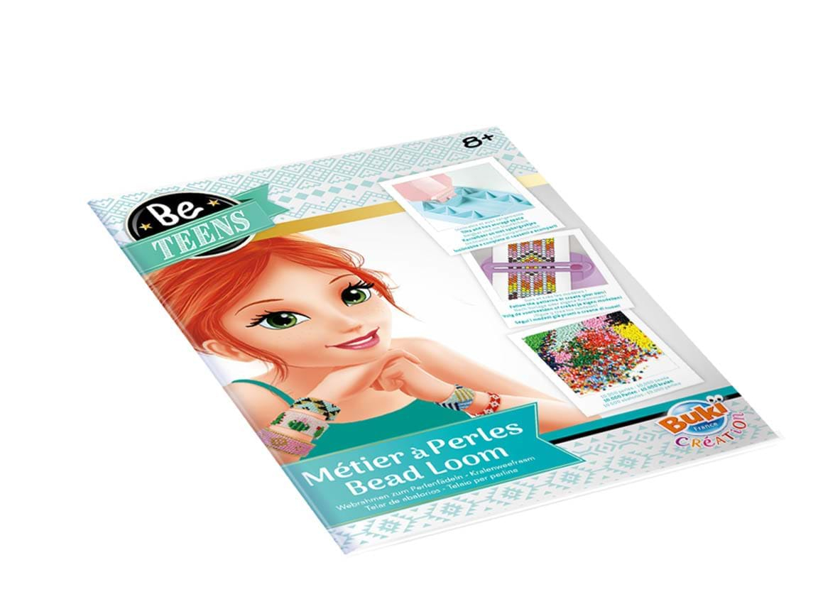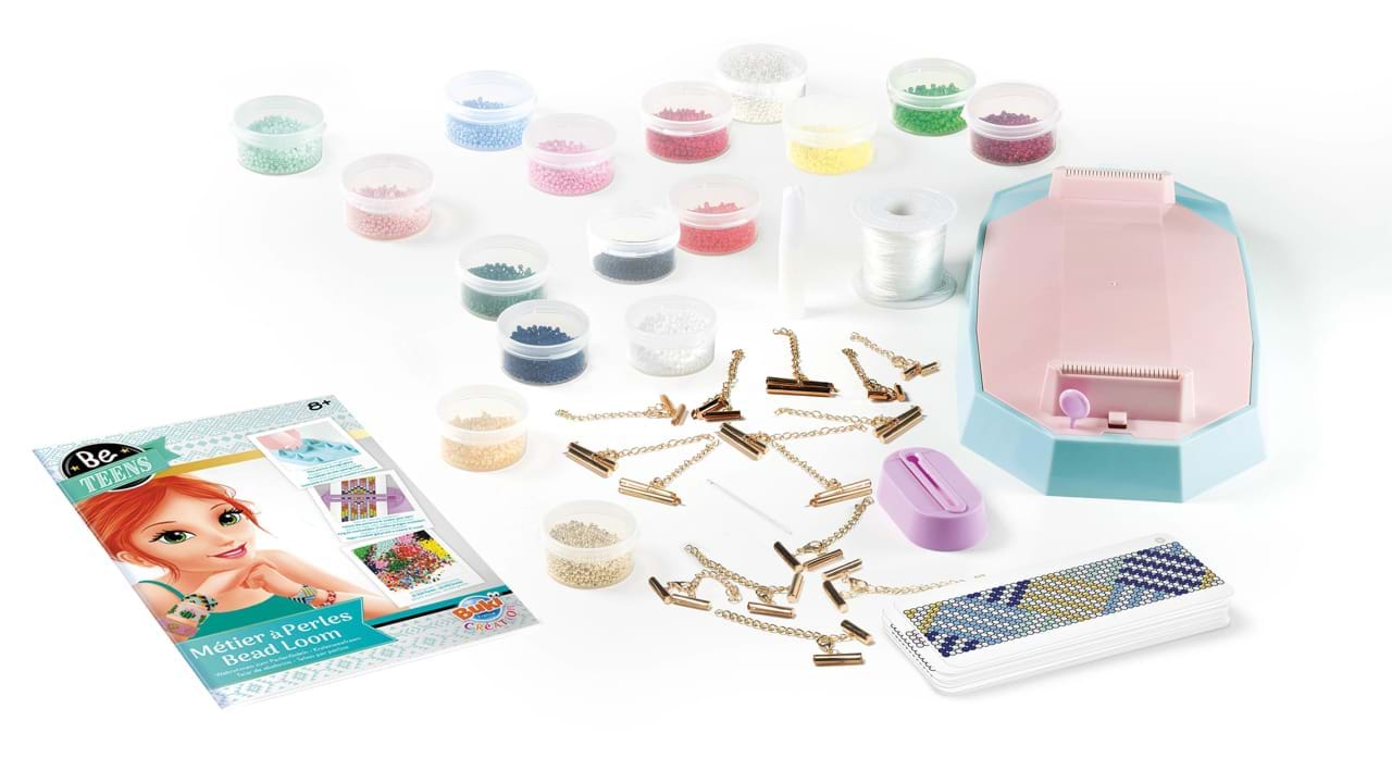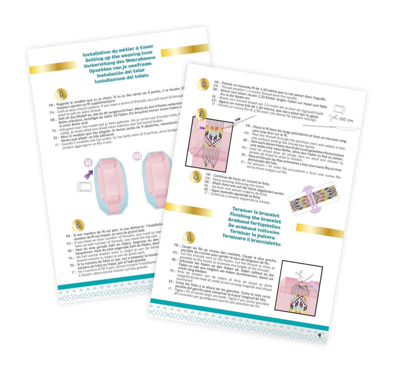 Continut cutie: 1 razboi de tesut, 10.000 de margele asortate, 15 incuietori, 1 tub de lipici, 1 bobina cu ata, 1 ac, 25 de planse cu modele, 1 prospect ilustrat.