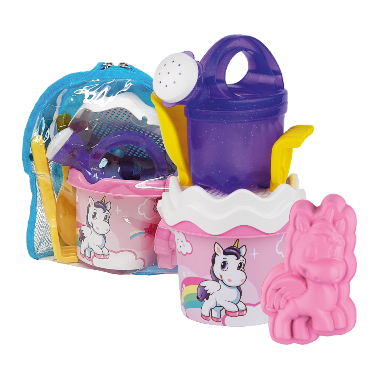Rucsac Unicorn cu unelte pentru apa si nisip, galetusa si stropitoare incluse este ideal pentru joaca la plaja, in nisipar sau in gradina. Copiii pot construi castele de nisip, se pot juca cu apa si isi pot dezvolta imaginatia prin activitati in aer liber.
