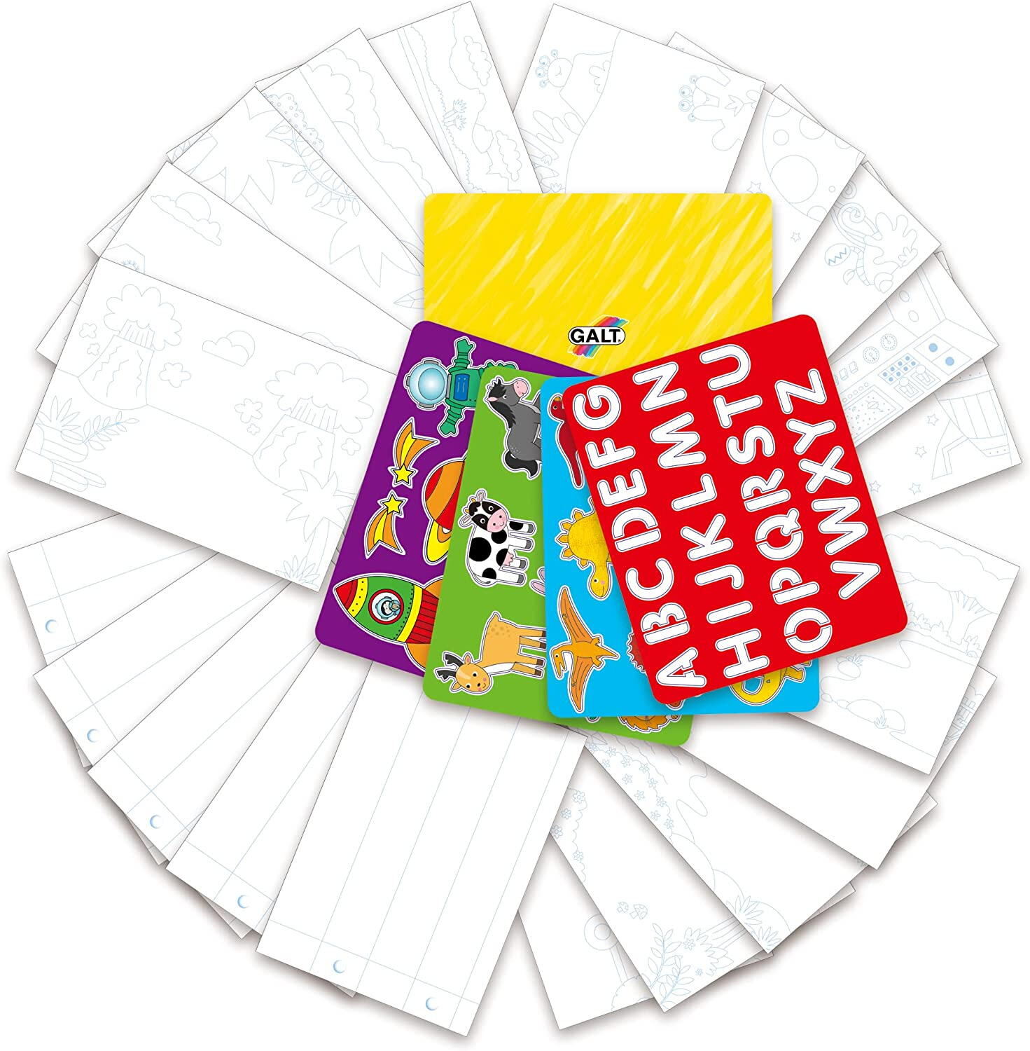 Setul Sabloane magnetice include un suport special tip rama, 20 de foi imprimate cu modele si 4 file cu peste 60 de sabloane magnetice. Totul este pregatit pentru ca cei mici sa-si lase imaginatia libera si sa creeze desene spectaculoase cu usurinta si precizie.