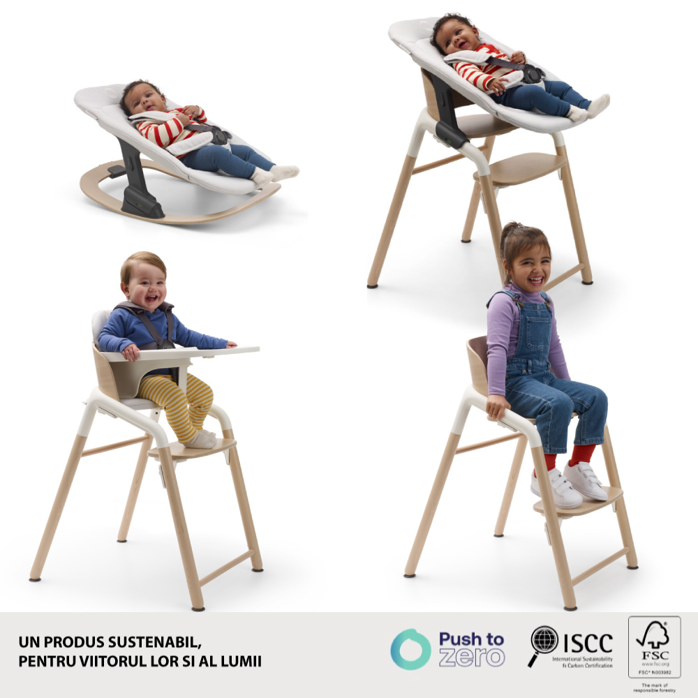 Scaunul Bugaboo Giraffe este realizat din lemn de fag european, certificat de Forest Stewardship Council pentru durabilitate. Toate piesele din plastic sunt construite din materiale pe baza biologica certificate ISCC, ceea ce inseamna ca amprenta de CO2 a lui Bugaboo Giraffe este cu 42% mai mica decat daca ar fi fost realizata folosind materiale plastice conventionale.