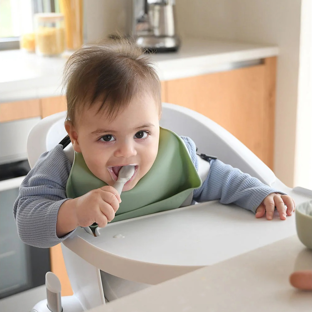 Set 2 linguri silicon Beaba Terracotta/Velvet Grey, cu forma si dimensiuni proiectate ergonomic.