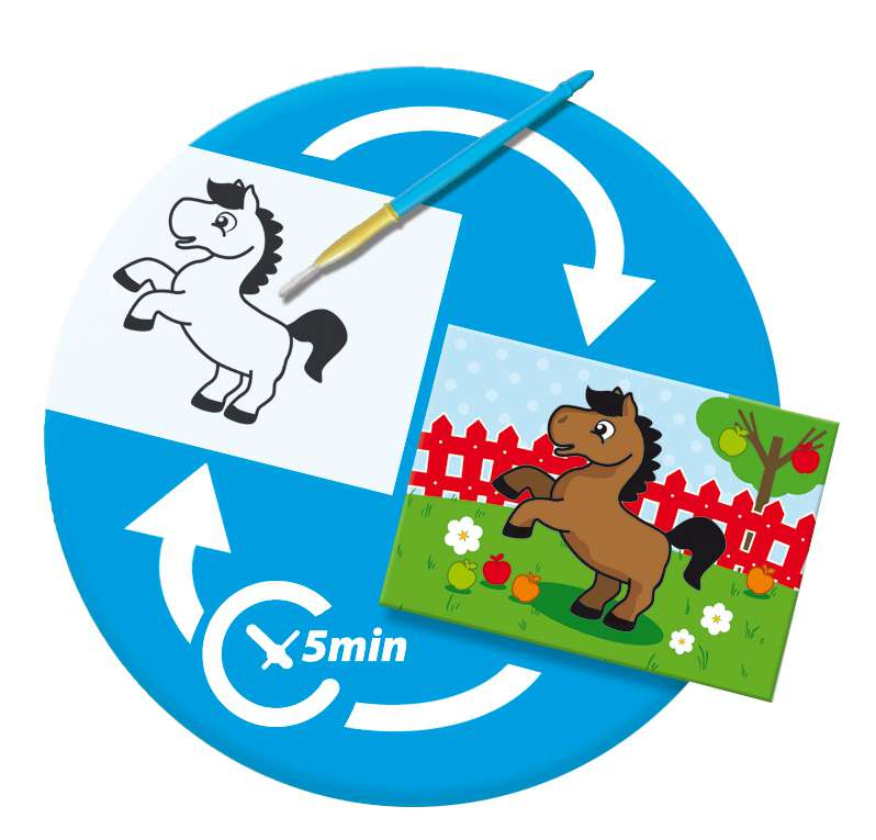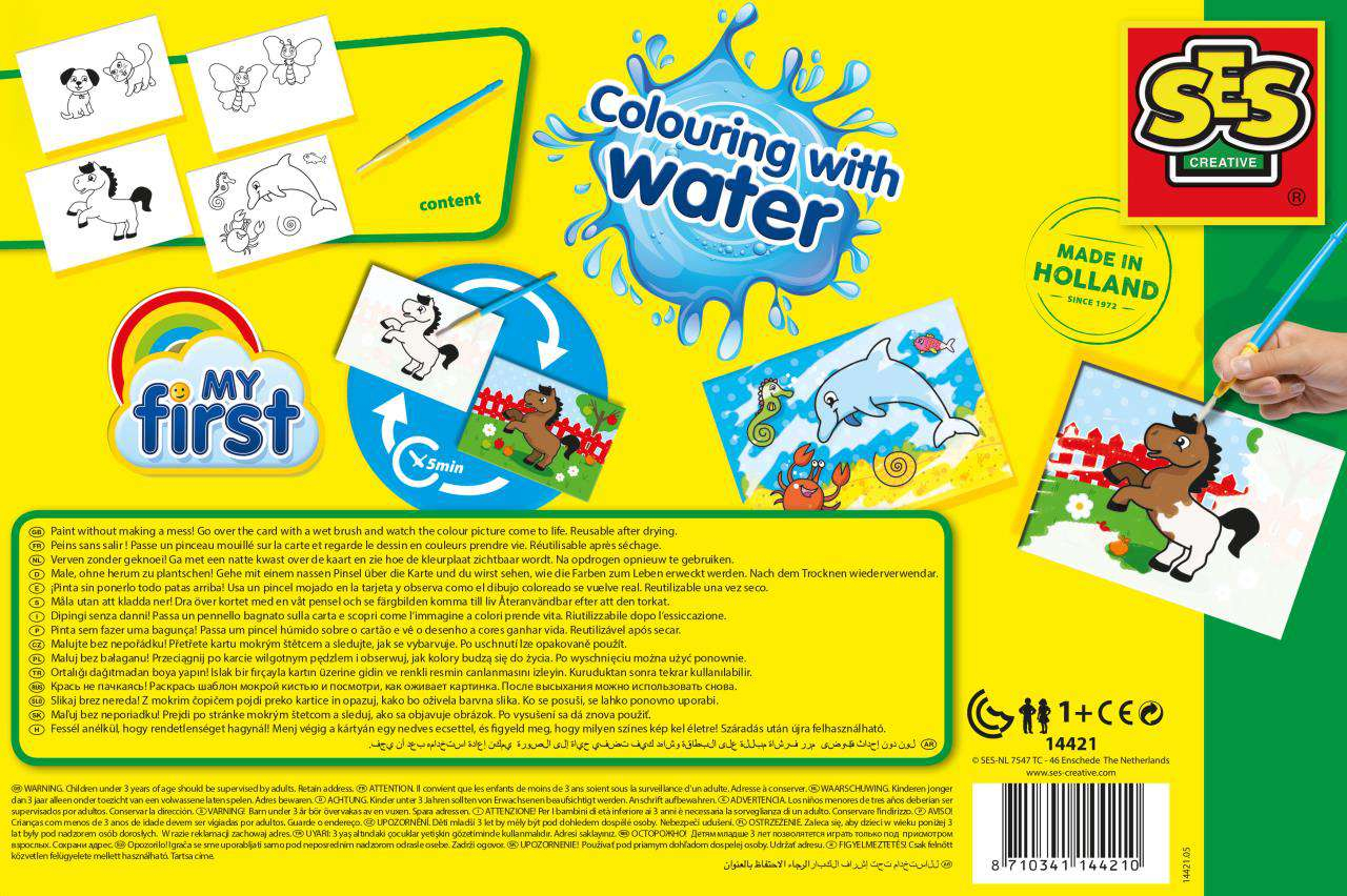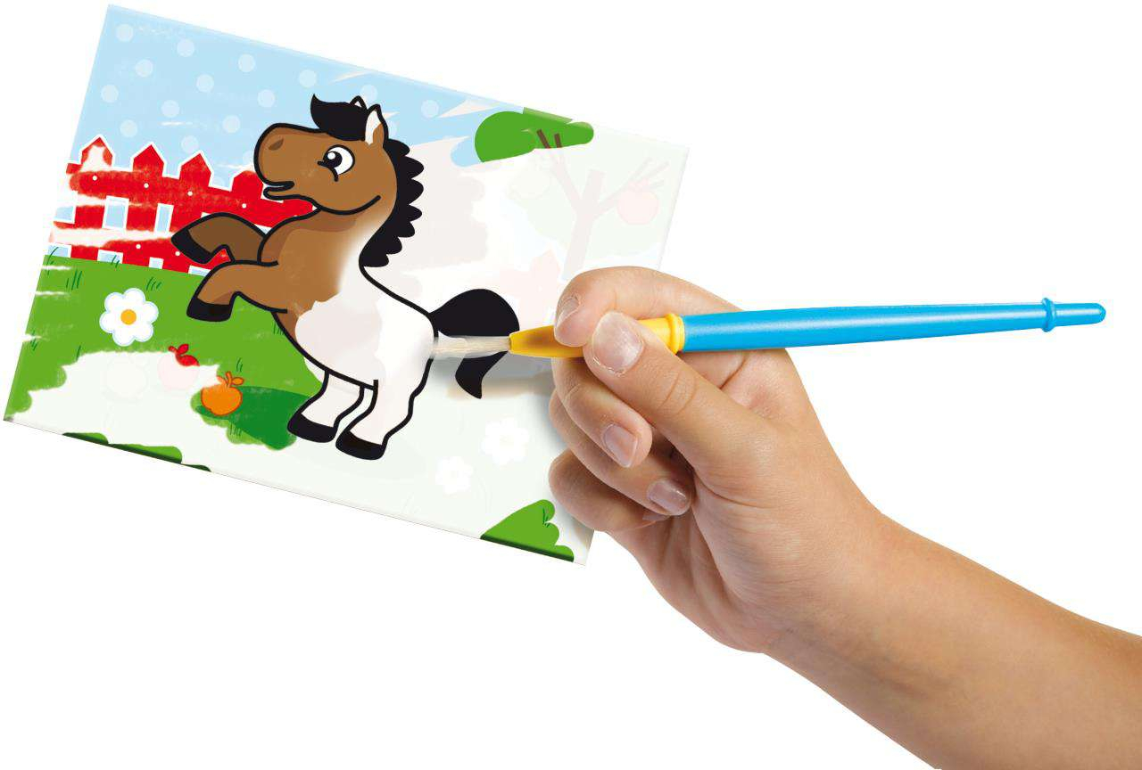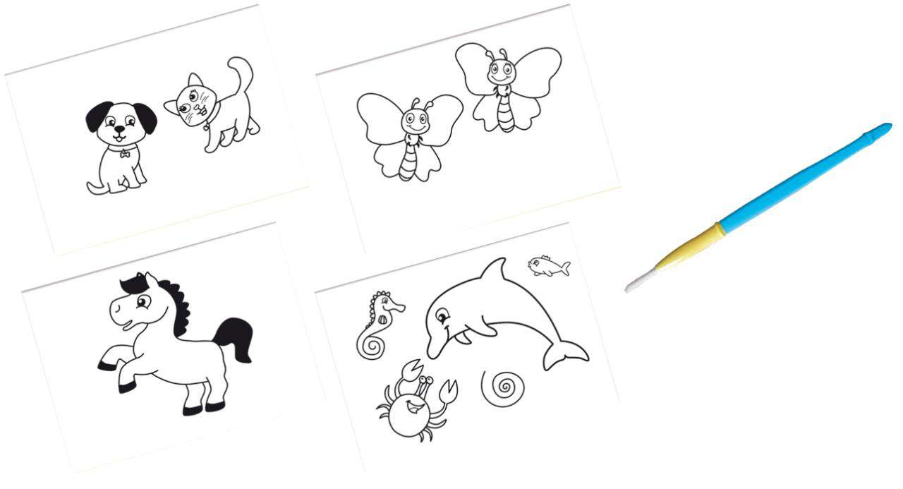 Set de Colorat cu Apa include o pensula speciala si 4 carti imprimate vesele. Imaginile colorate apar atunci cand sunt umezite, apoi redevin albe dupa uscare, fiind gata pentru o noua sesiune de joaca.