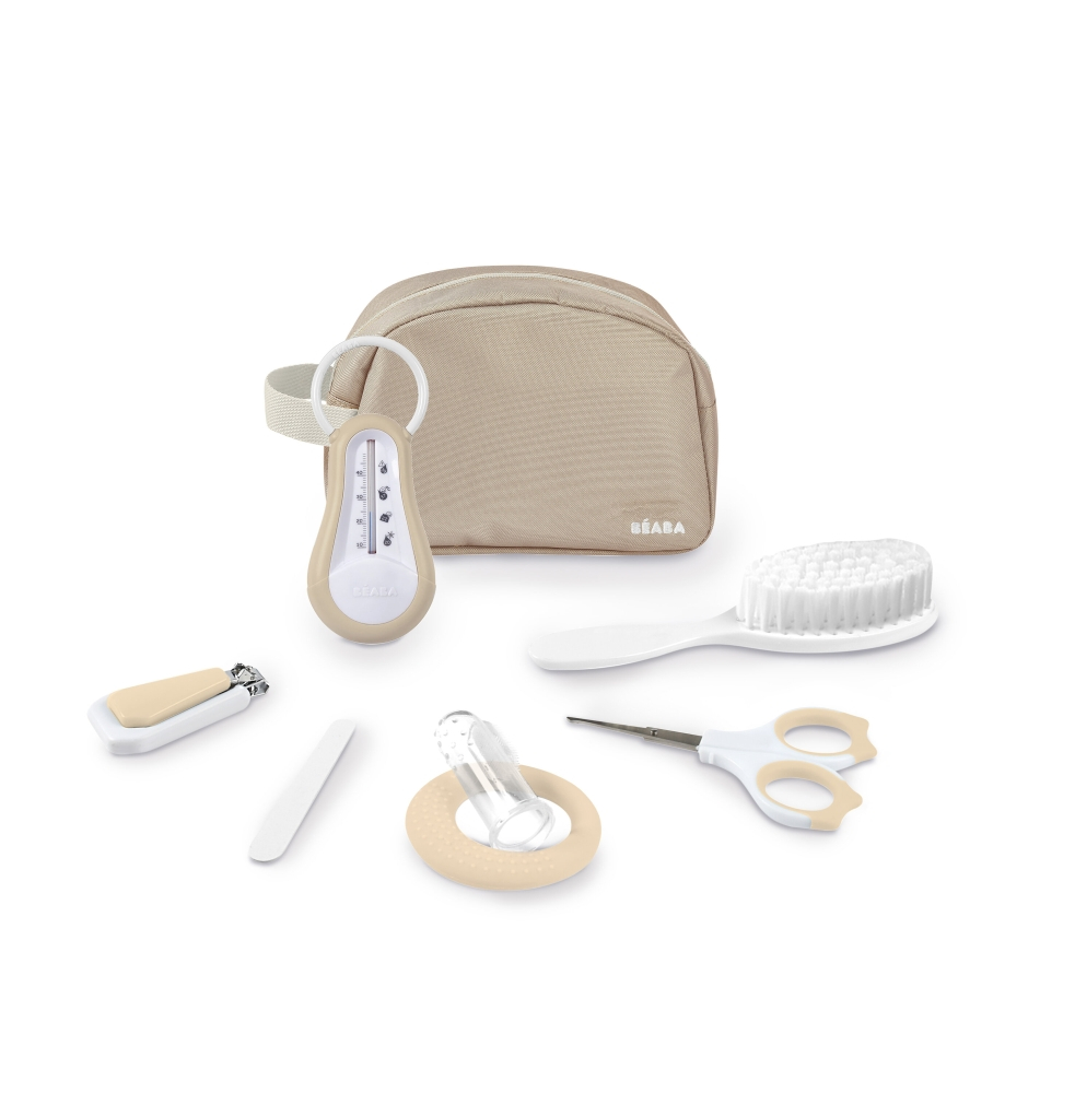 In interior vei gasi 7 accesorii gandite pentru nevoile reale ale unui bebelus: termometru de baie pentru controlul temperaturii apei, forfecuta cu varfuri rotunjite, unghiera, perie de par moale, plus elemente pentru confortul in perioada eruptiilor dentare si pentru ingrijirea unghiilor. Set de ingrijire Beaba 7 piese Clay acopera astfel atat momentul baitei, cat si micile ritualuri de ingrijire de dupa, fara sa fie nevoie sa cumperi accesorii separate.