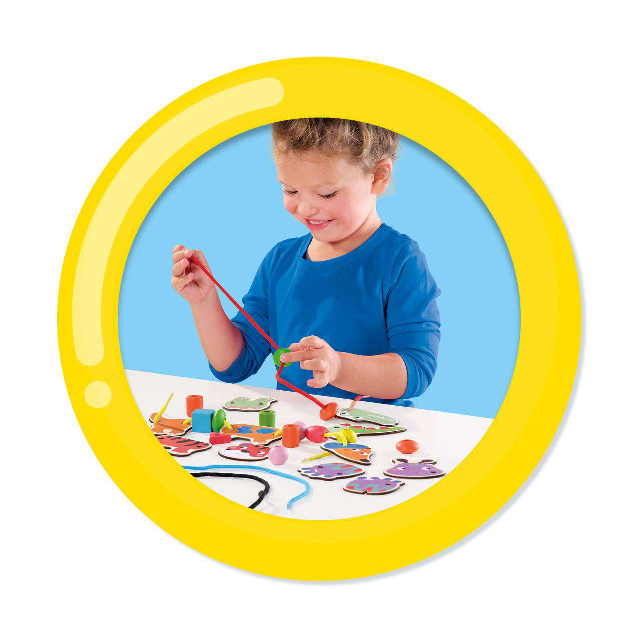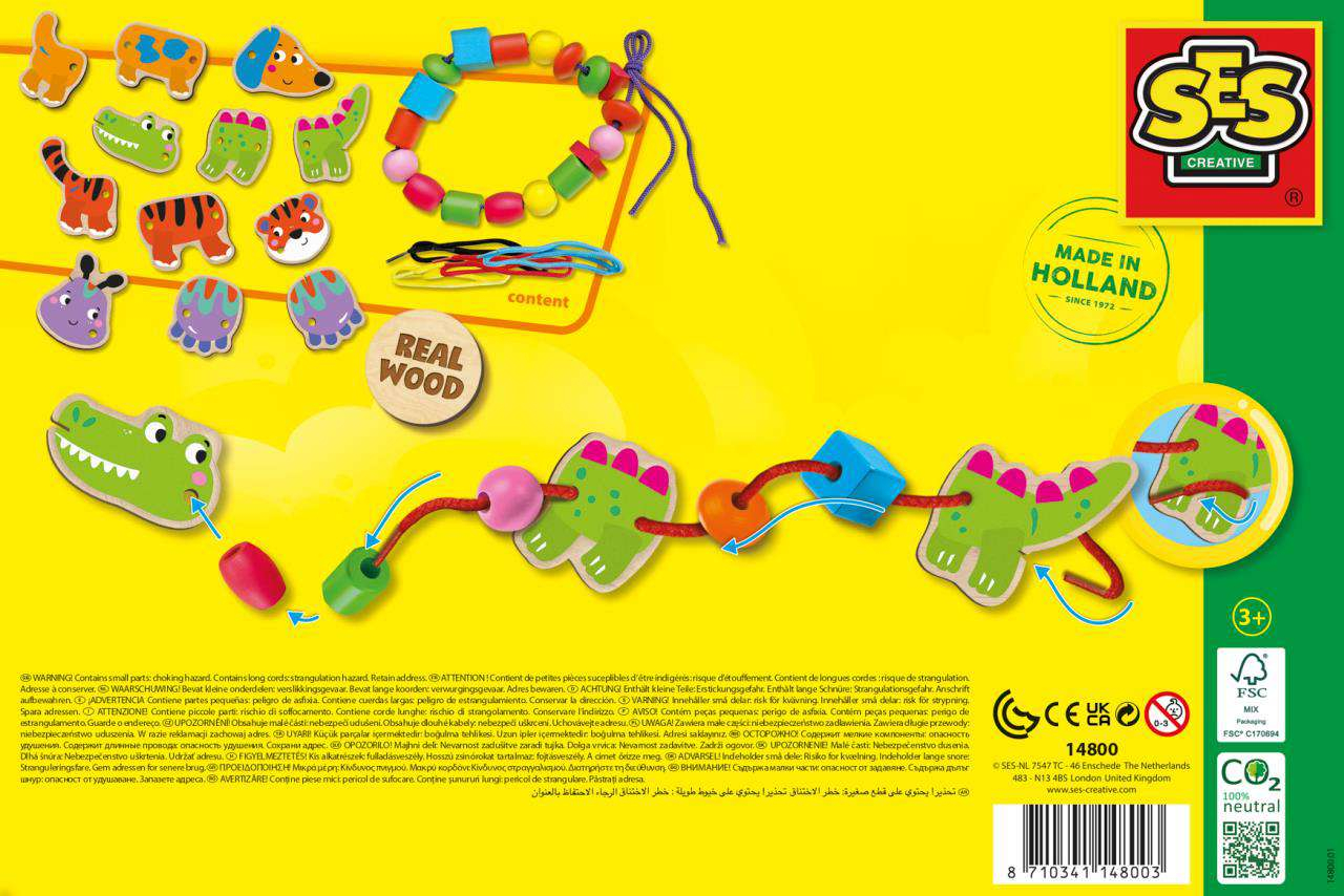 Setul contine 12 piese din lemn pentru animale, 18 margele mari din lemn si 4 culori diferite de sireturi rezistente, toate concepute pentru a oferi ore intregi de distractie educativa.