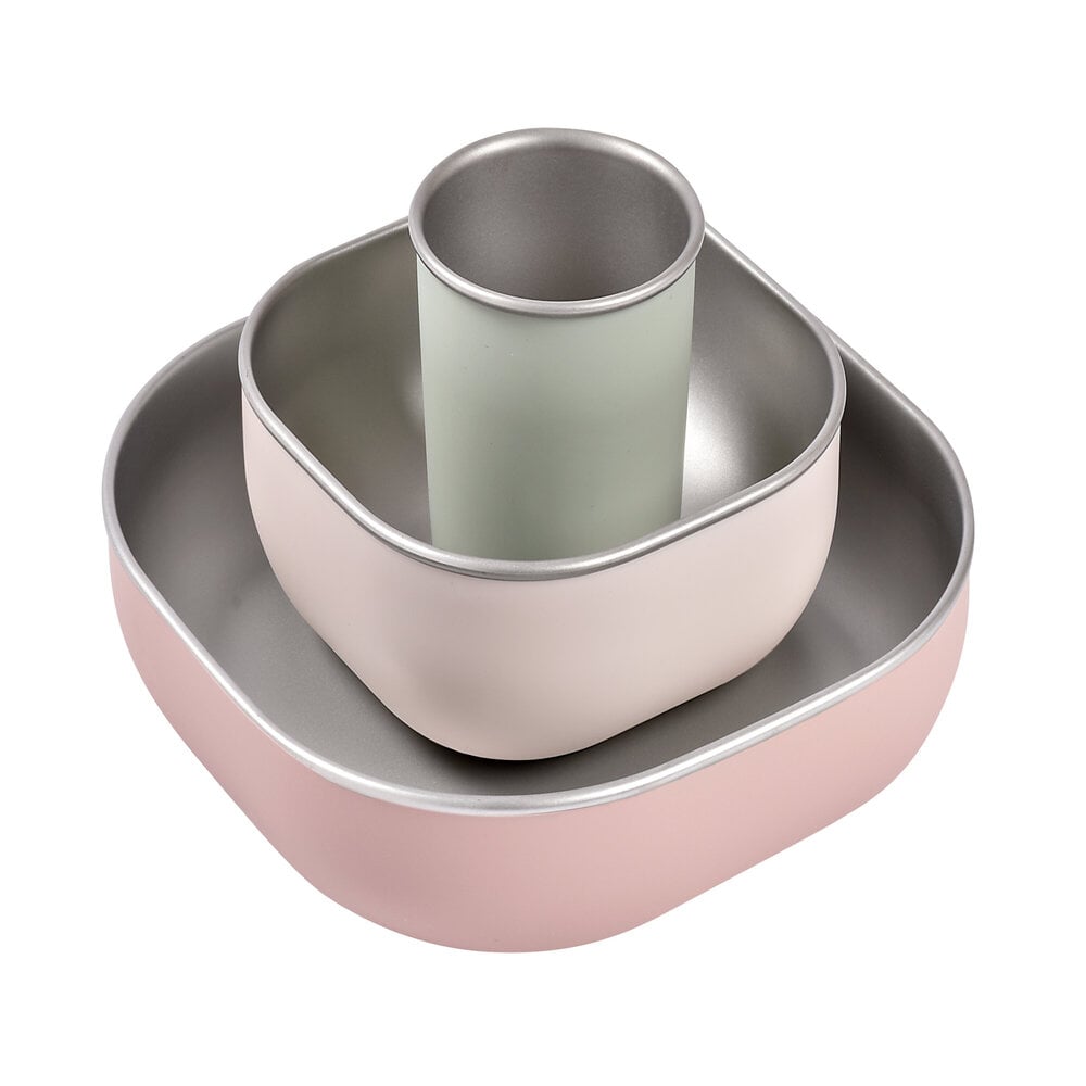 Setul de masa Beaba din otel inoxidabil Cotton Candy include o farfurie, un bol si o cana ergonomica, special dimensionate pentru copii. Formele rotunjite si marginile inalte faciliteaza utilizarea zilnica, iar dimensiunile sunt ideale pentru portii adaptate varstei.