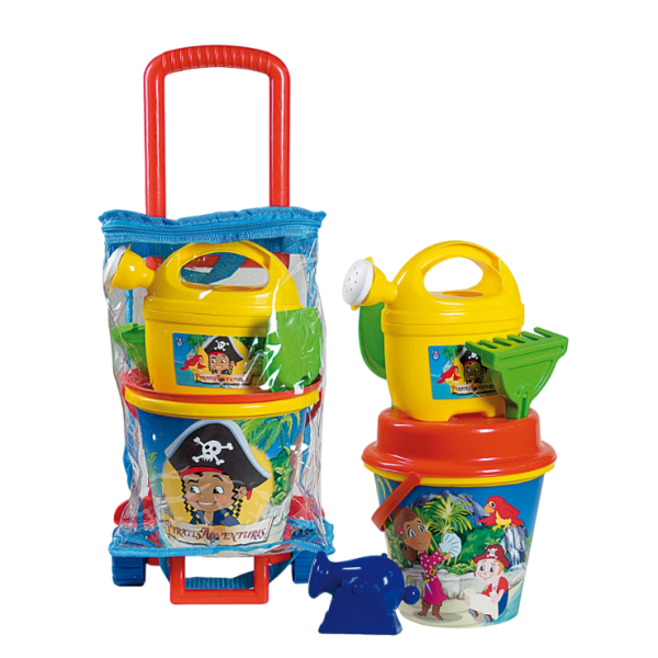 Set jucarii pentru plaja cu troler Pirati transforma joaca in aer liber intr-o aventura pe cinste. Cu un troler incapator si personaje simpatice, copiii au la indemana tot ce le trebuie pentru o zi plina de distractie pe malul marii.