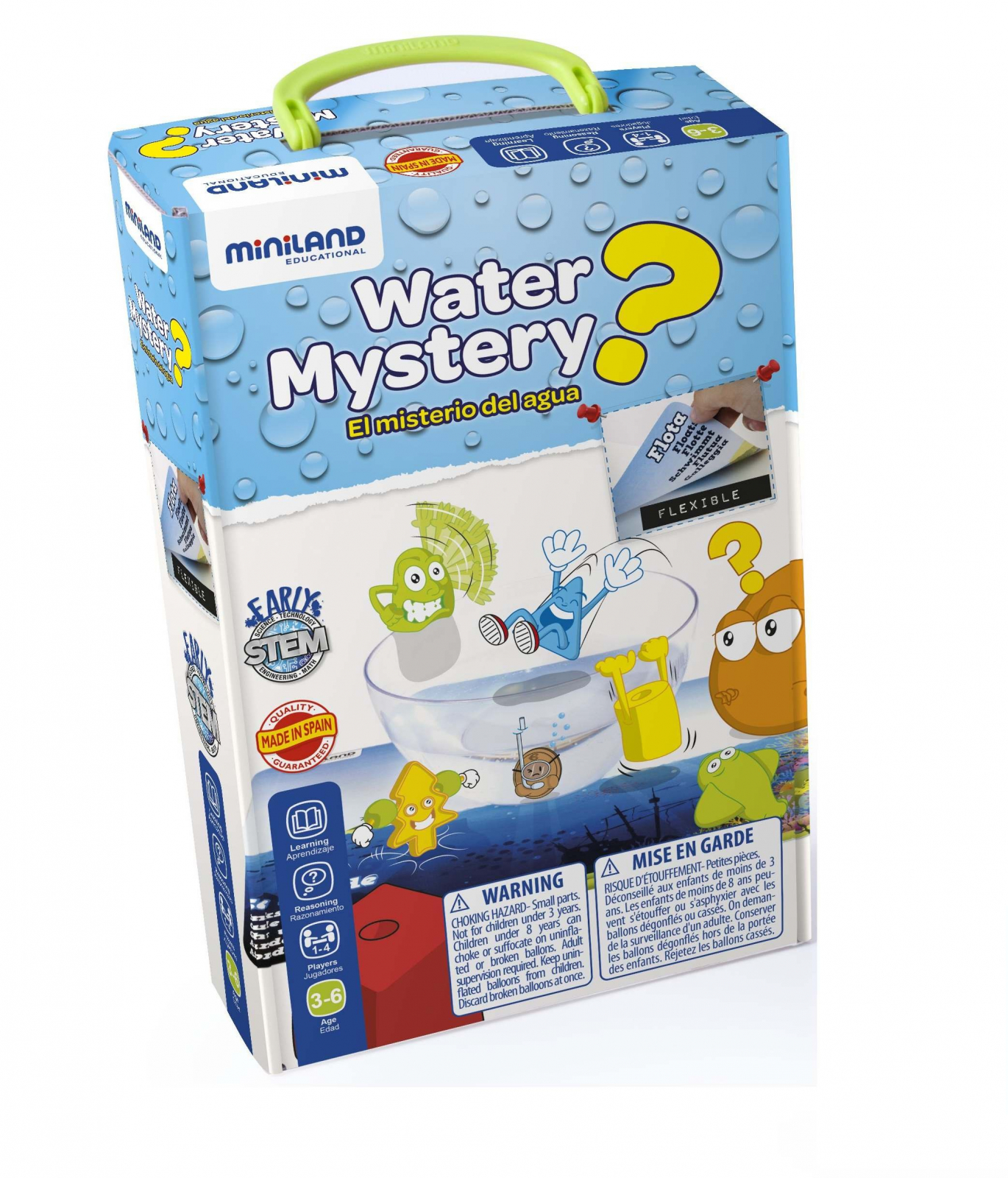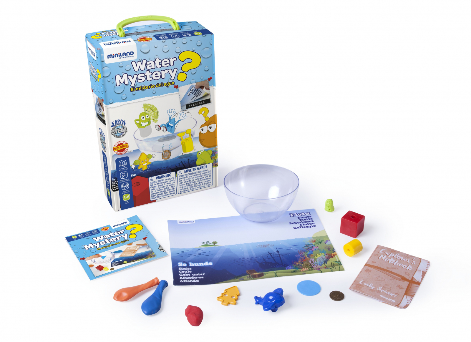Set pentru experimente Misterele apei - Miniland este fabricat din materiale rezistente si sigure pentru copii. Este recomandat utilizarea sub supravegherea unui adult. Nu lasati ambalajele la indemana copiilor si pastrati produsul departe de surse de caldura si umiditate.