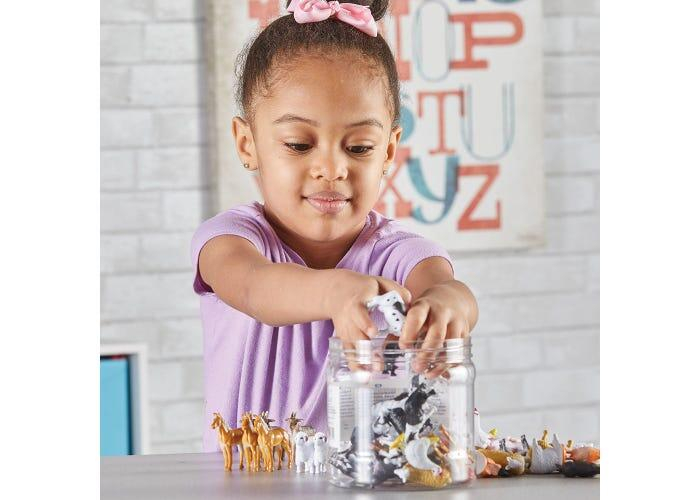 Set pentru sortat - Animalutele mele preferate contine 60 de piese din plastic cu detalii realiste, reprezentand 10 specii diferite de animale domestice. Fiecare animalut apare in cate 6 exemplare, iar cele mai mari figurine, cum ar fi calul, masoara 5 x 5 cm. Piesele vin ambalate intr-o cutie practica din plastic cu capac pentru depozitare usoara.