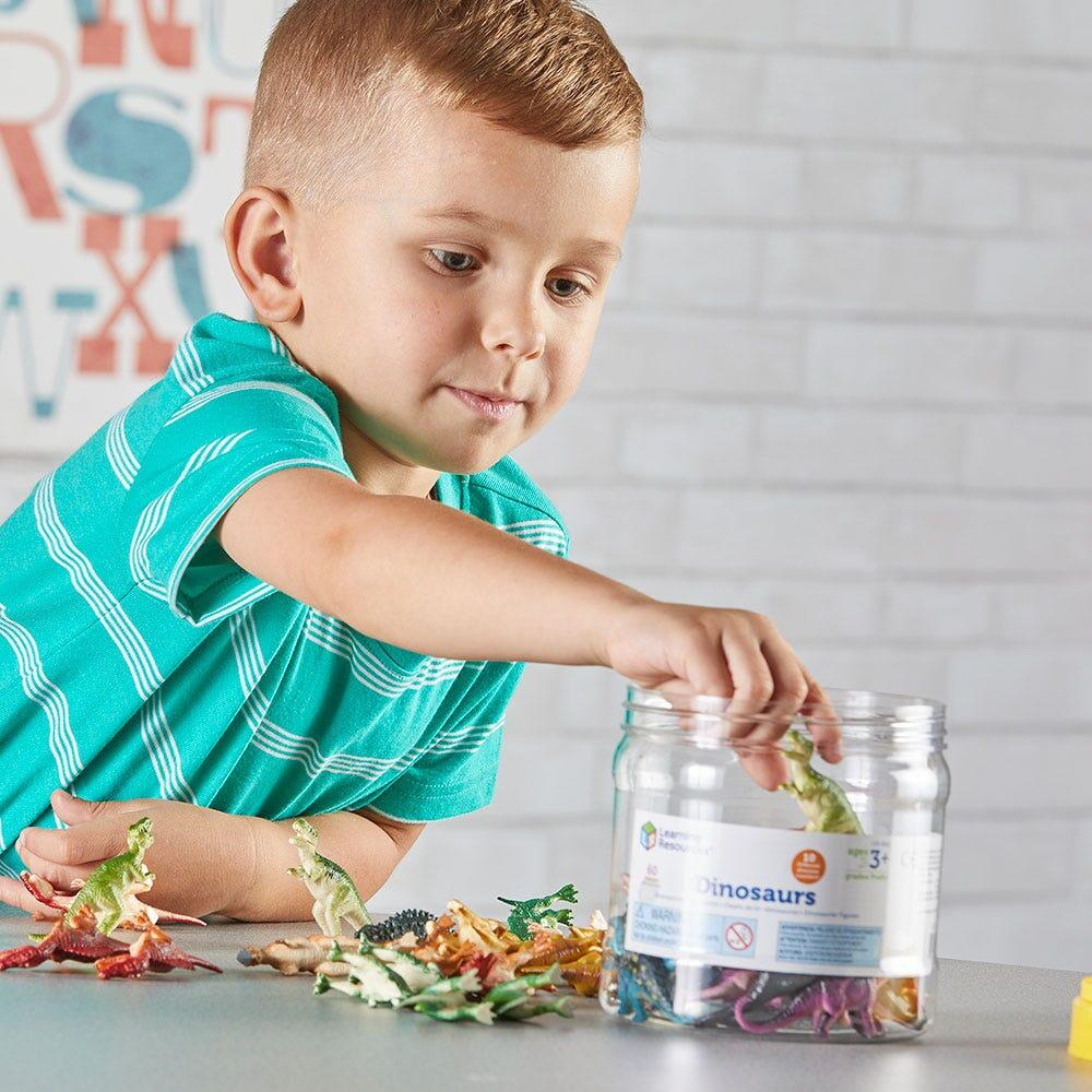 Setul include 60 de piese reprezentand dinozauri jucausi: Tyrannosaurus Rex, Stegosaurus, Triceratops, Brachiosaurus, Pachycephalosaurus, Spinosaurus, Stuthiosaurus, Apatosaurus si Velociraptor. Fiecare dinozaur este realizat cu detalii realiste si este ideal pentru jocuri de rol si invatare prin joaca. Cele mai mari figurine masoara 5 x 5 cm. Set pentru sortat - Dinozauri jucausi (60 piese) vine ambalat intr-o cutie de plastic cu capac, usor de depozitat.