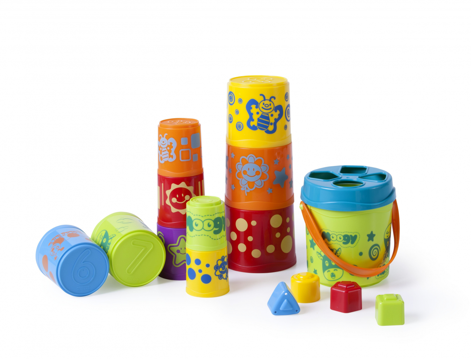 Fiecare forma este colorata si are ilustratii diferite. Pe dosul cupelor sunt inscrise cifre. Setul contine o galetusa cu maner, 10 cupe cu dimensiuni progresive, un capac cu orificii pentru sortare si patru forme de sortat. Sortare forme Giantte Moogy - Miniland este potrivit pentru joaca acasa, in parc sau la plaja.