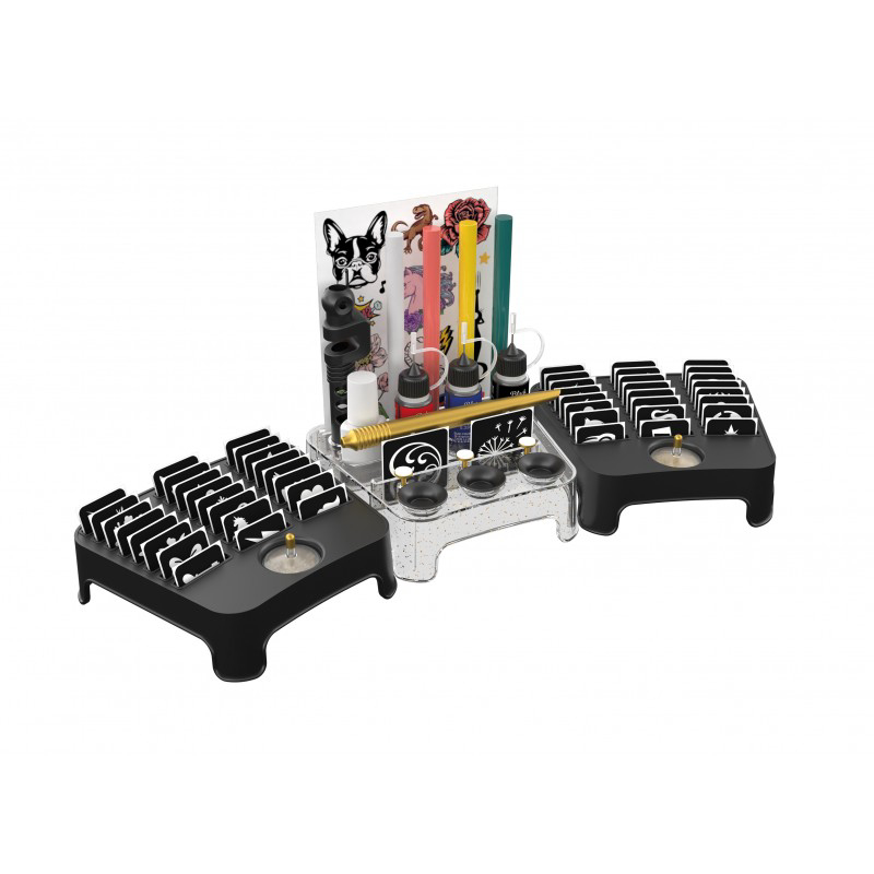 Studio Profesional De Tatuaje, un set complet care iti permite sa creezi tatuaje temporare spectaculoase direct pe piele. Fie ca folosesti sabloanele incluse, desenezi cu mana libera sau adaugi sclipici, experienta este una autentica si captivanta.