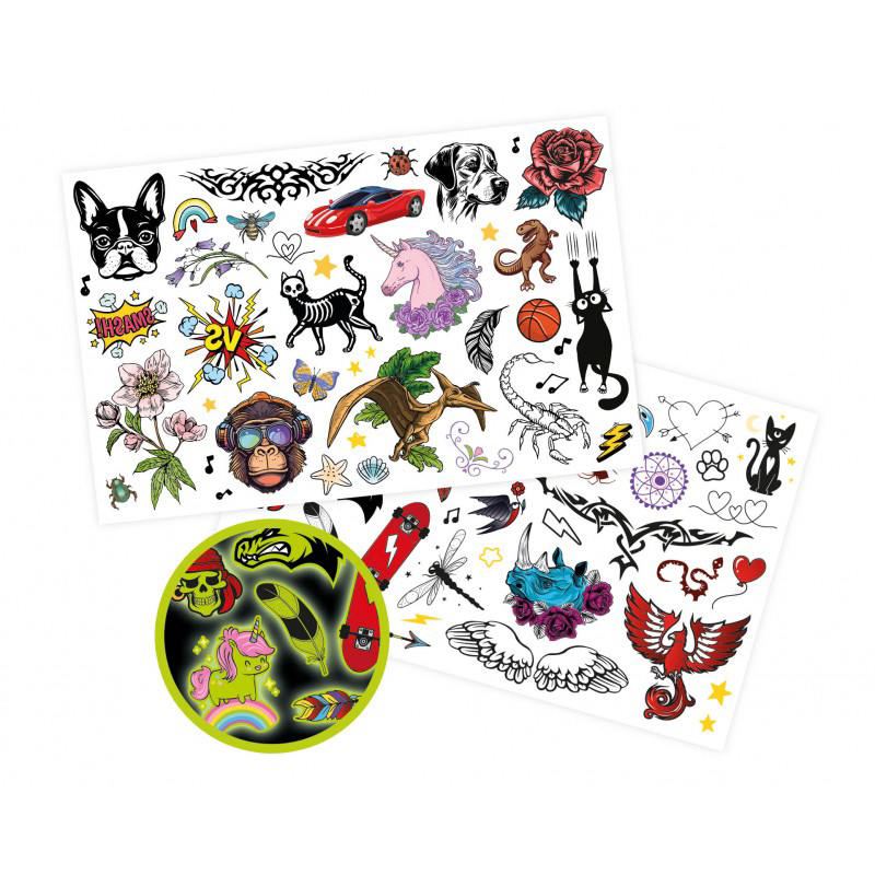 Studio Profesional De Tatuaje include 4 stilouri pentru tatuaje, 3 cerneluri, sclipici, sabloane si tatuaje temporare care stralucesc in intuneric. Cerneala si tatuajele pot fi indepartate usor dupa cateva zile cu apa sau demachiant, in functie de piele.