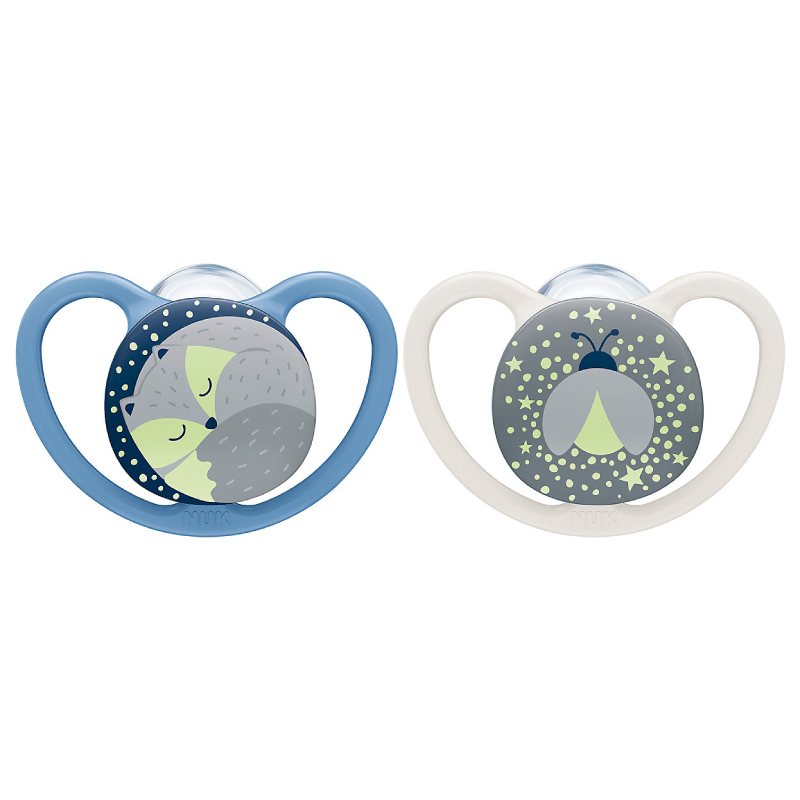 Suzeta Nuk Space Night Silicon 0-6 luni Albastru, Set 2 Bucati - permite pielii sensibile a bebelusilor sa respire.