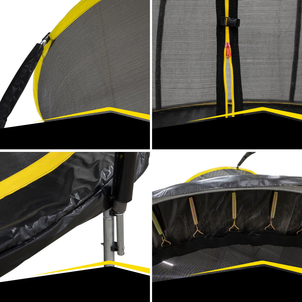 Trambulina Dunlop cu diametru de 183 cm este perfecta pentru copiii de diferite varste si are o capacitate maxima de incarcare de 80 kg. Pentru a preveni accidentele, trambulina este echipata cu plasa de siguranta care se poate inchide cu fermoar. Un clips suplimentar va asigura ca cei mici nu pot deschide fermoarul plasei de siguranta. Atat constructia din otel, cat si arcurile trambulinei sunt extrem de robuste si durabile.