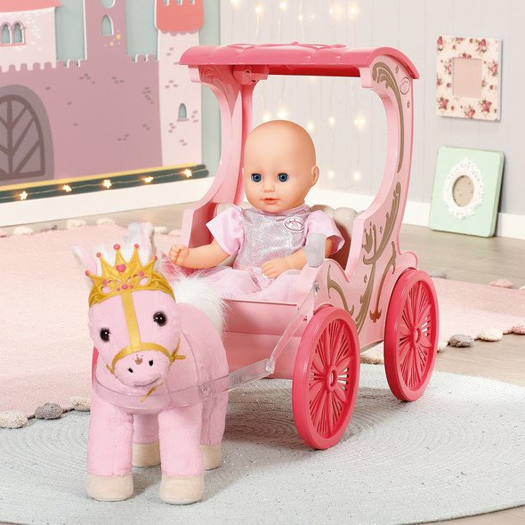 Cu o inaltime de 58 cm, manerul poate fi, de asemenea, indepartat si depozitat pe trasura in sine. De indata ce trasura incepe sa se miste, cele doua coroane din fata se aprind. Trasura roz, cu acoperis si roti roz, este decorata cu ornamente de culoare aurie. In timp ce micuta printesa adorabila sta confortabil pe scaunul alb, in spatele acesteia exista un spatiu suplimentar pentru prietena ei, Micuta Annabell, pentru broasca din fantana sau chiar pentru un cufar cu comori.