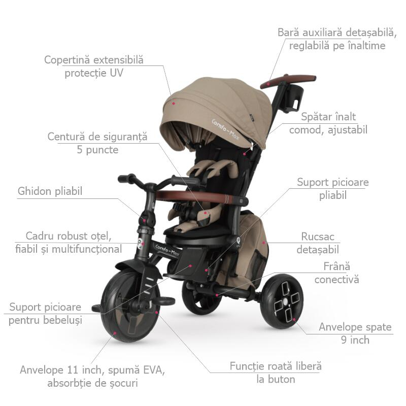 Comandați acum Tricicleta Qplay Comfo Max Bej și bucurați-vă de plimbări memorabile alături de micuțul dumneavoastră!