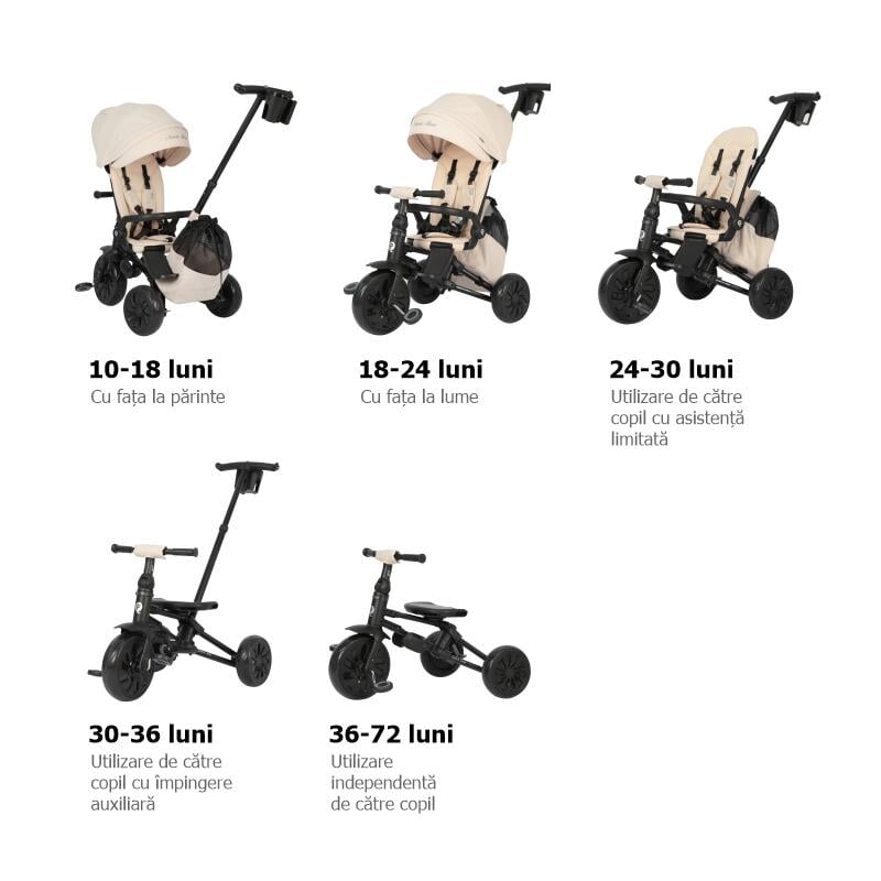• Pe parcurs, se transformă în tricicletă independentă: piesele utive (centură, bârnă parentală, copertină) pot fi îndepărtate pentru libertate totală.